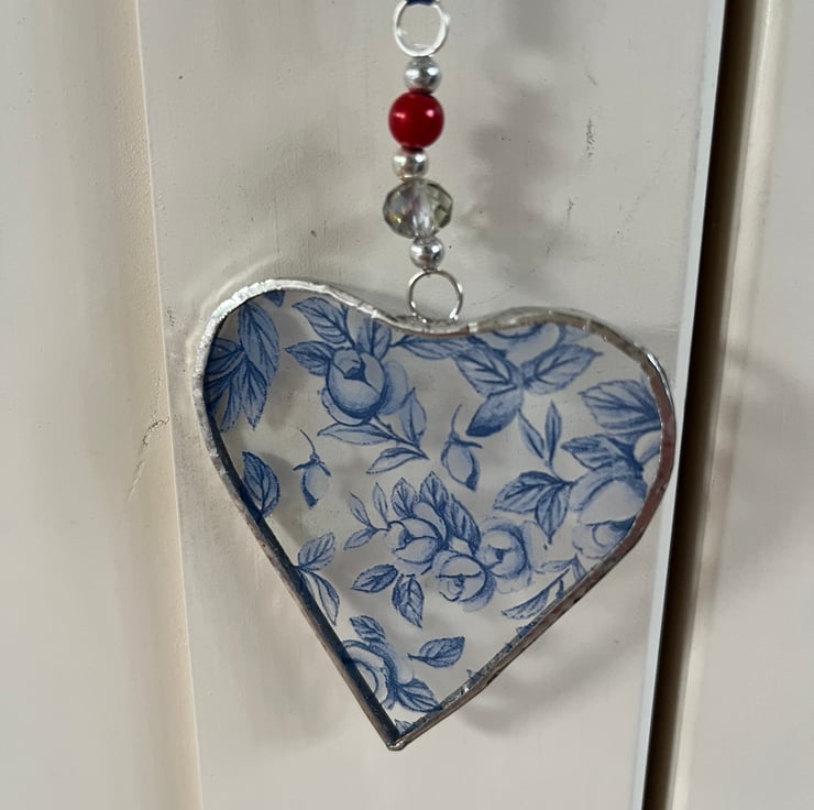 A beautiful stained glass heart made using the Tiffany (copper foiled) method of stained glass. It has been made using a lovely blue flowery glass.