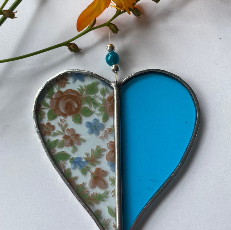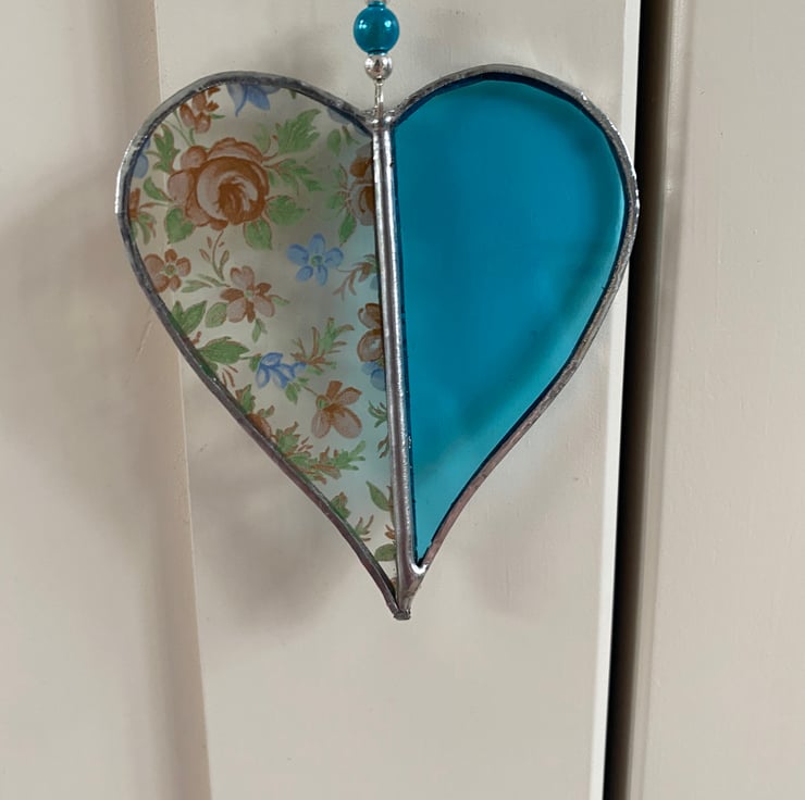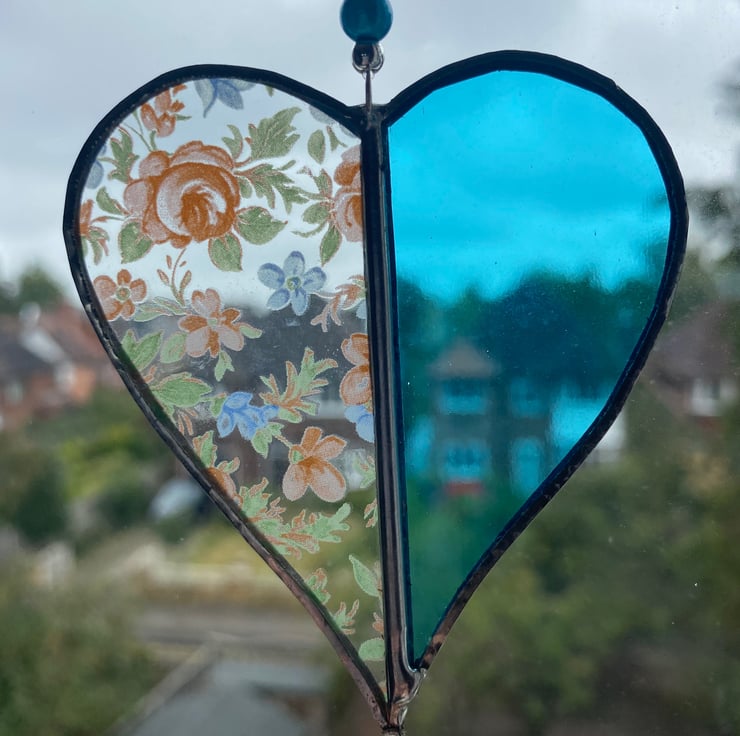A beautiful 2 tone stained glass heart made using the Tiffany ( copper foiled ) method of stained glass . Each half is a different colour (turquoise, blue and pink flowery pattern )
