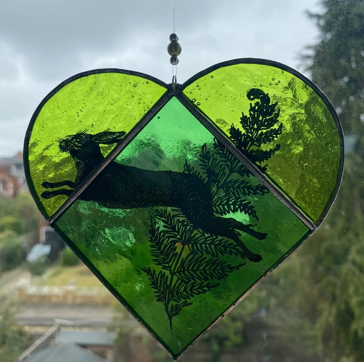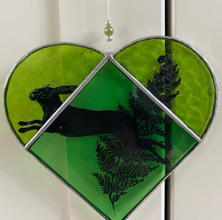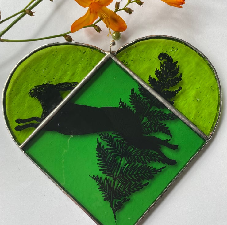 A beautiful 2 tone stained glass heart made using the Tiffany ( copper foiled ) method of stained glass . The main body is a green and the tops a beautiful lime green glass .The heart has an image of a hare and a fern which has been screen printed on in black enamel and then fired.