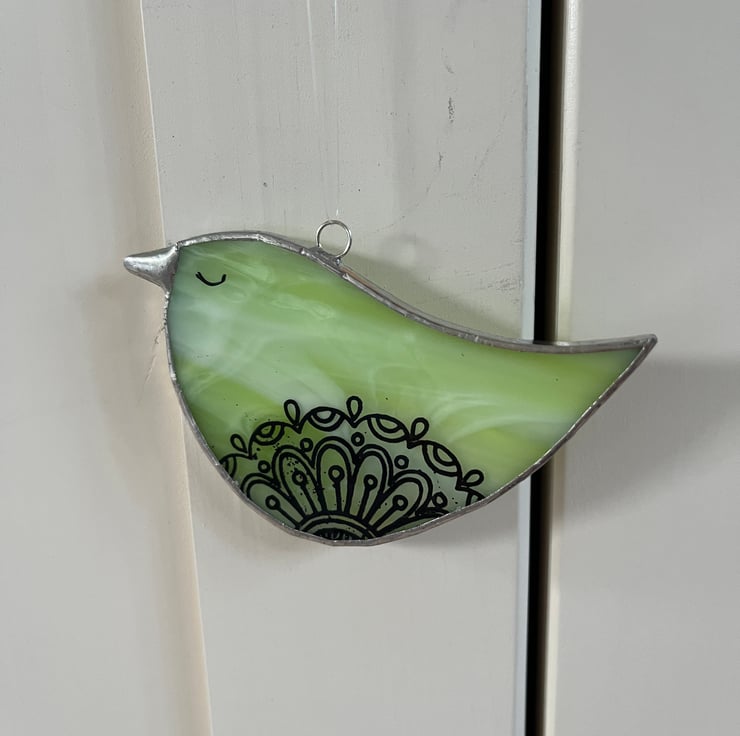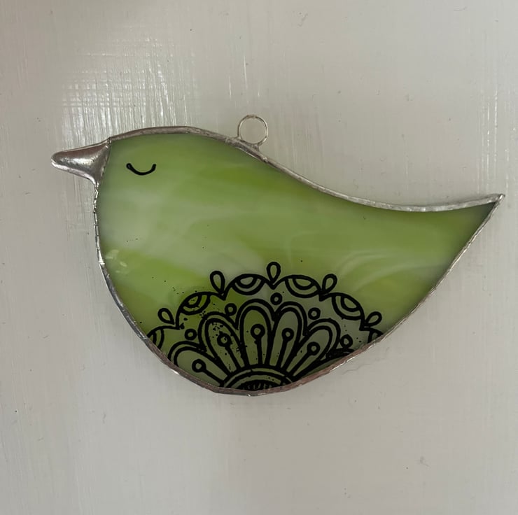 A cute little birdie made using the copper foiled ( Tiffany) method of stained glass. He/she is made in a green opaque glass with a mandala design screen printed on in black enamel before being fired in the kiln . The beak is silver solder and there is a nylon hanging string.