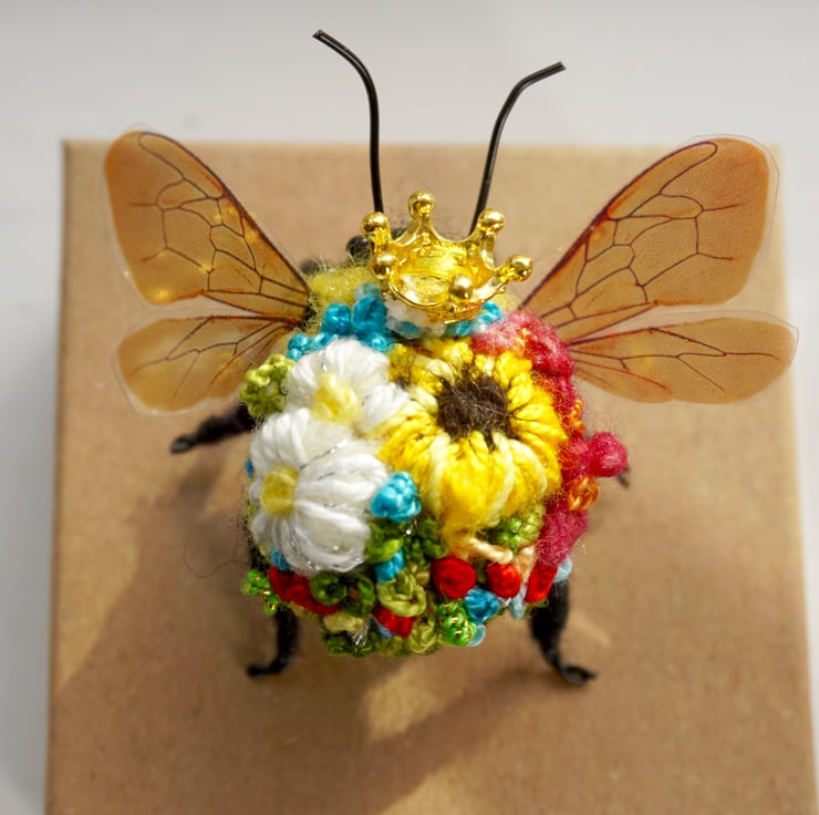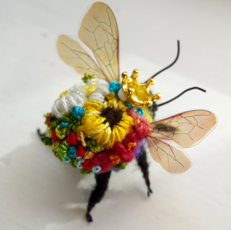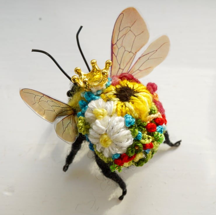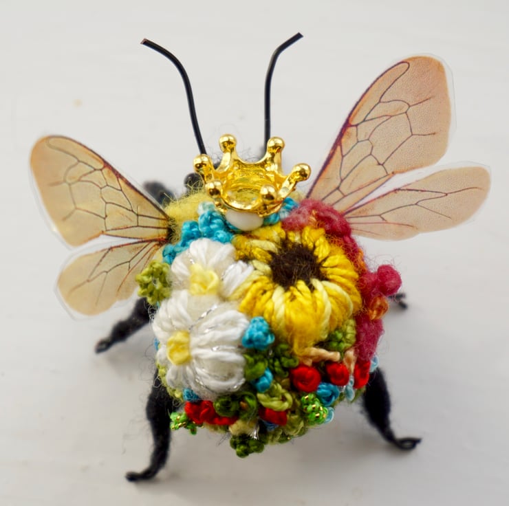 Needle felted and embroidered flower bee, measures approx 3 cm long by 5cm wide .Your bee will come with a fine gold hanging thread ,which can be snipped off if not required,Gift box included.This is actual bee you can purchase.