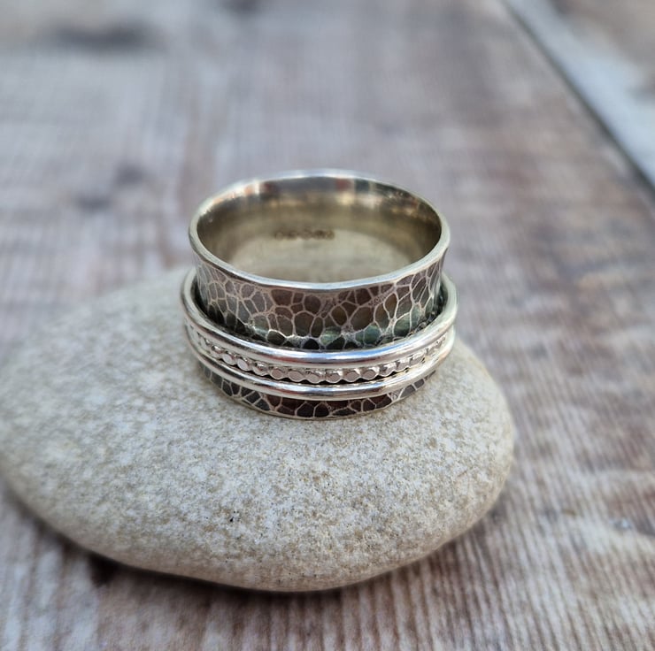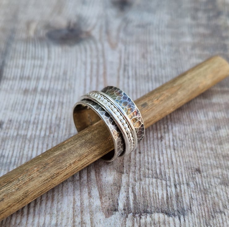 This handmade sterling silver spinner ring features three distinct spinning bands, each one offering a unique texture. The wide, hammered oxidised band creates a beautiful backdrop for the three sterling silver spinners – one beaded, one smooth, and one with a delicate rope texture. Crafted in Bristol, UK, from recycled sterling silver, this ring combines tactile movement with a modern, rustic aesthetic.