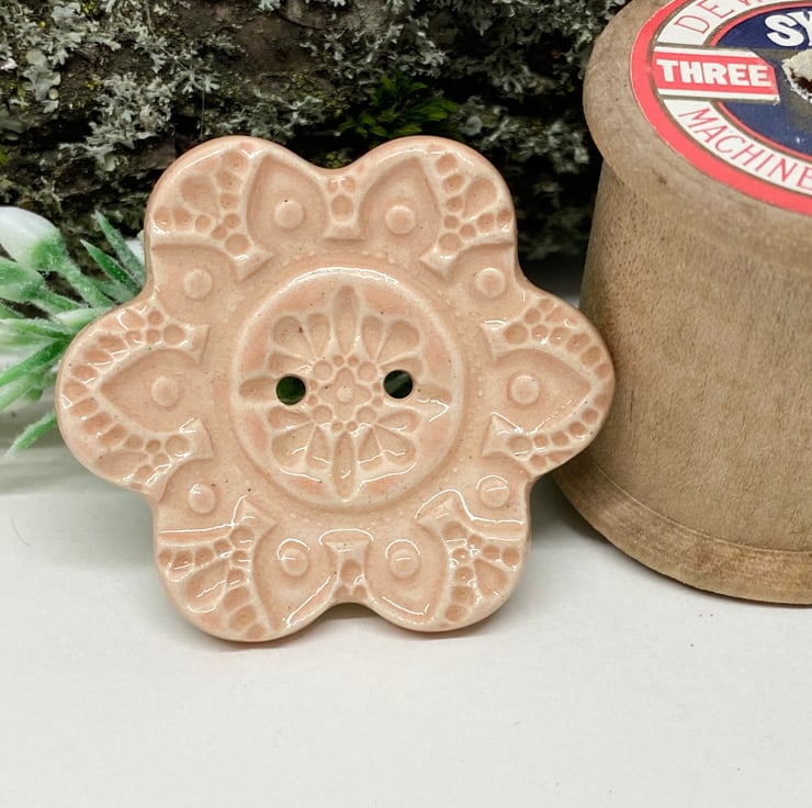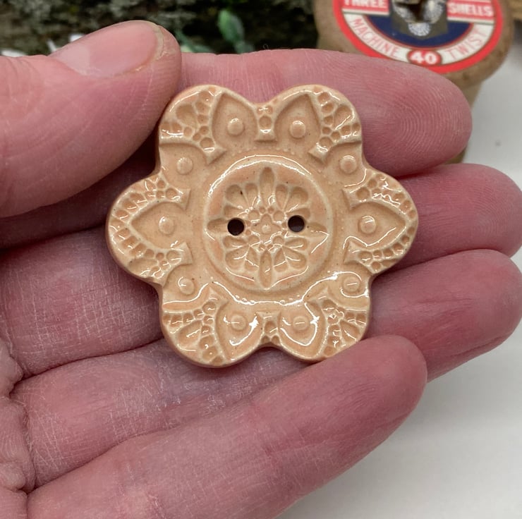 This large pottery button is made from white earthenware clay, embossed and glazed on the front. It is then fired to 1100 degrees, so nice and strong. Slightly concave. It measures 4cm x 3.5cm.They can be handwashed or machine washed on a low temperature. Perfect for all sorts of arts and craft projects.