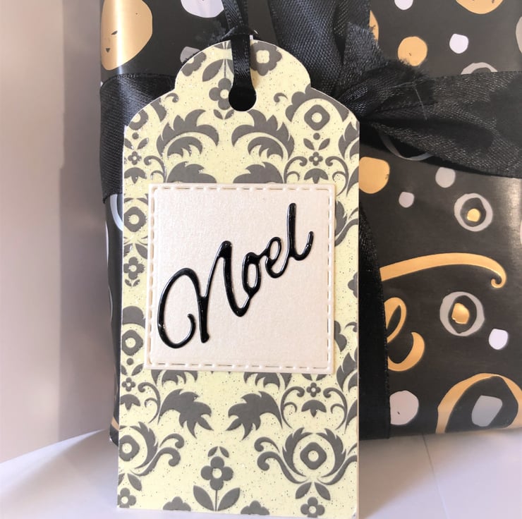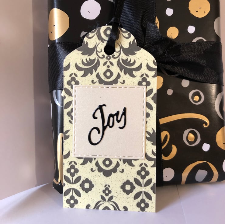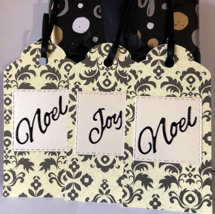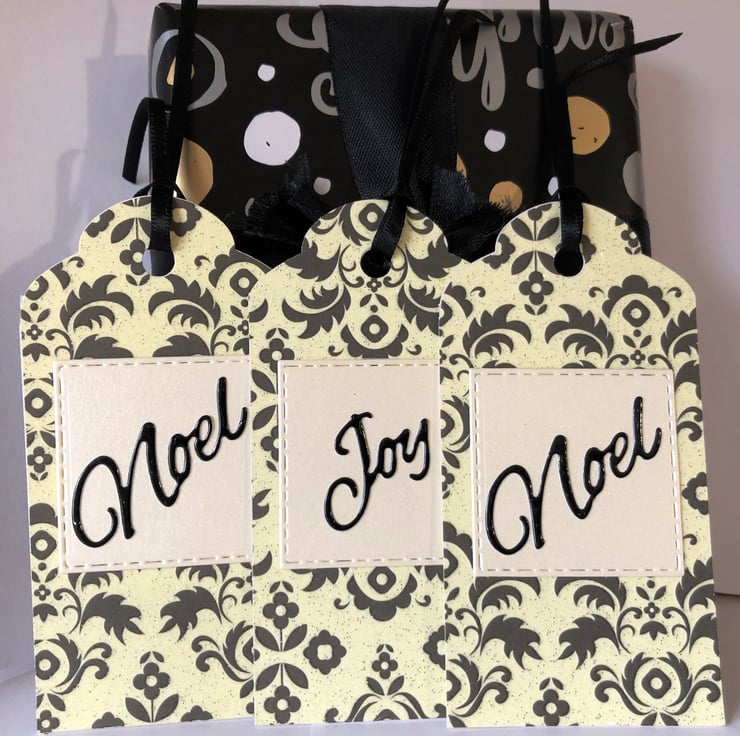 - 1 with word 'Joy' and 2 with 'Noel' attached to enhance this premium gift tag. Centre piece is made using rich cream pearlescent card and each tag is finished off with rich black ribbon.