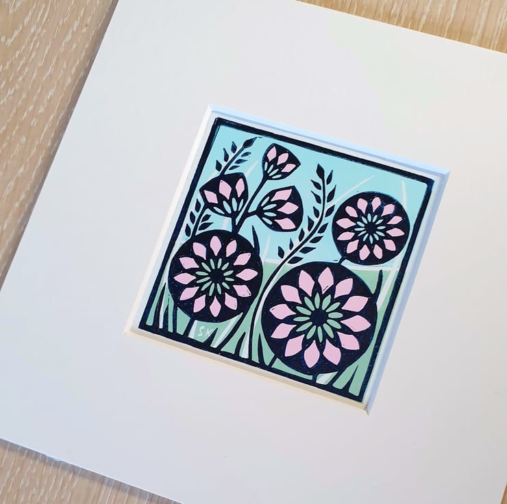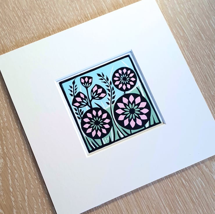 This is an original linoprint of some pretty pink flowers amongst some grass. The design has been printed over three layers.