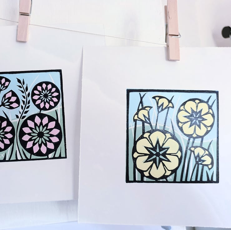 Each print is handprinted using Caligo safe wash inks. They are printed on Zerkall printmaking paper. The ink is transferred from the block to the paper by rubbing with the back of a metal spoon.
