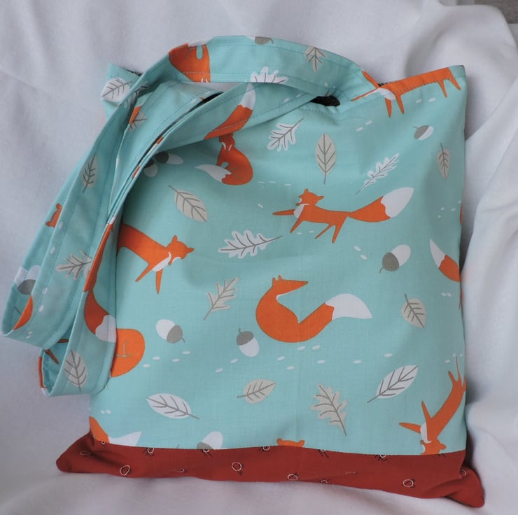 Seconds Sunday clearance item. This fun tote bag has been made with a lovely fabric depicting orange and white foxes on a turquoise background with a smattering of leaves and acorns in white and taupe. Lined with a cream cotton fabric to one side and a blue, cream and brown geometic patterned fabric to the other side.