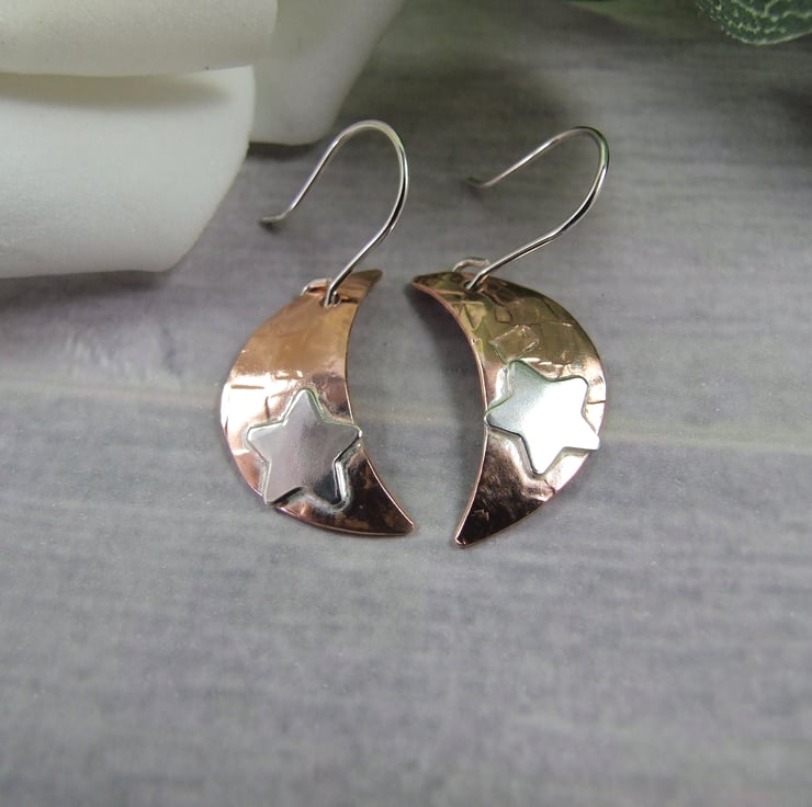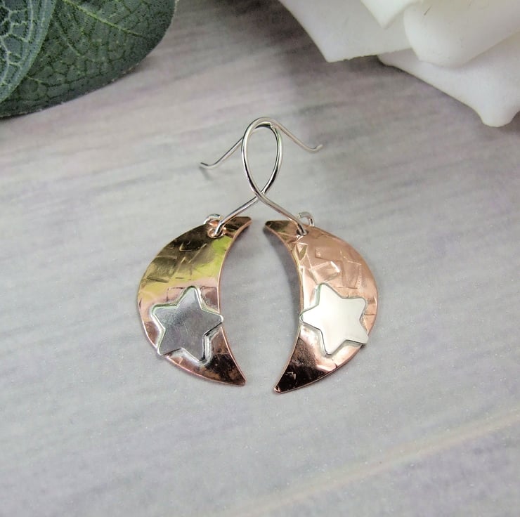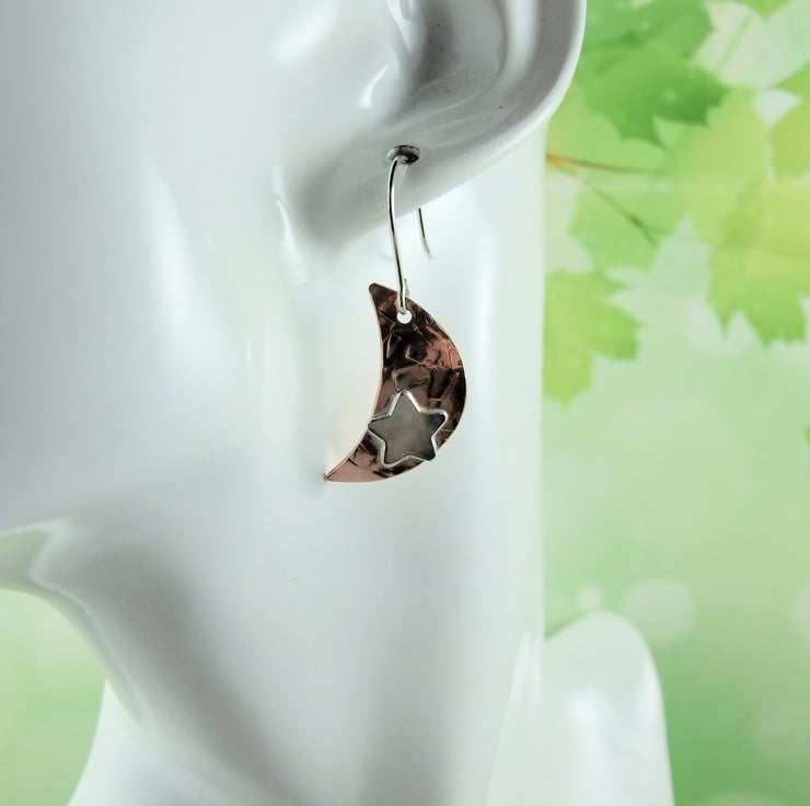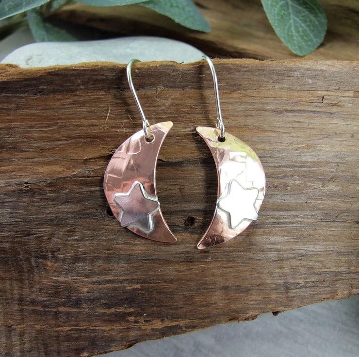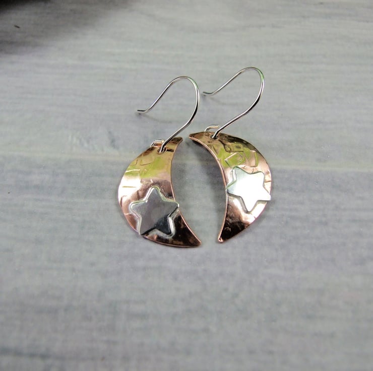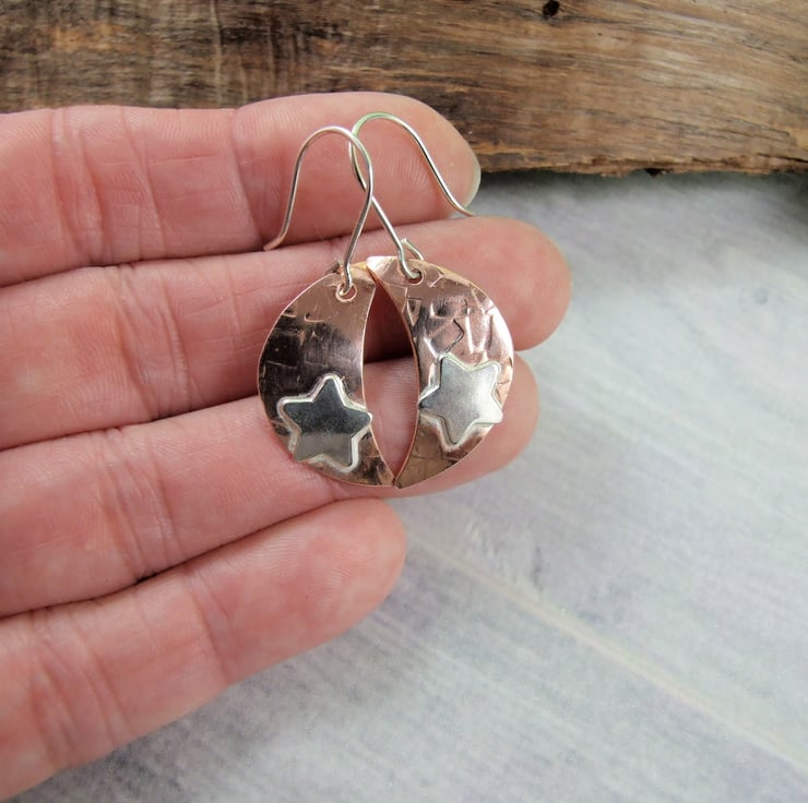 I have created the moon shapes from copper sheet, hand cut and textured with a pattern, I then slightly domed the shape and then soldered on some sterling silver stars. Fitted to sterling silver ear hooks