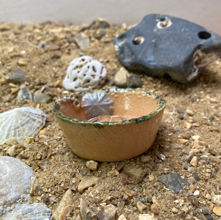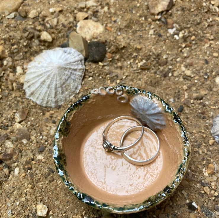 A charming handmade little dish with limpet shell design , reminiscent of a trip to the beach. This cute pot could be a ring dish or even used at table for condiments.