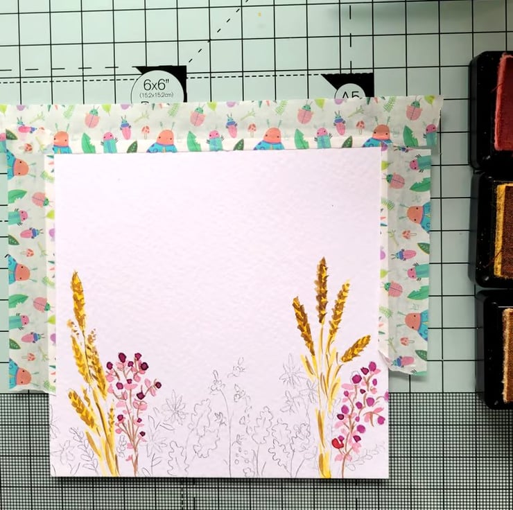 The card base is white recycled cardstock and has a layered design. Sketched then watercoloured with small details added with a black and white fine liner pens.