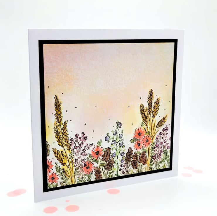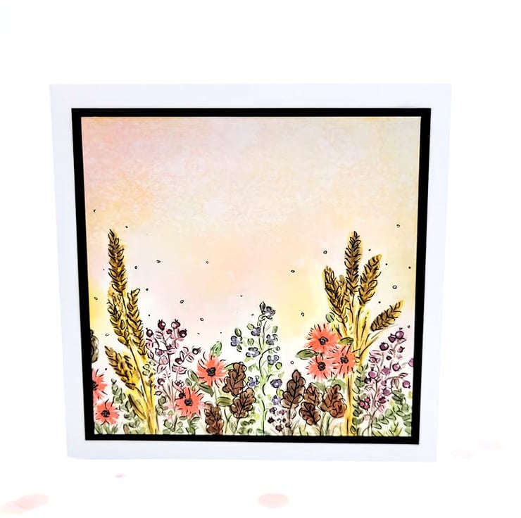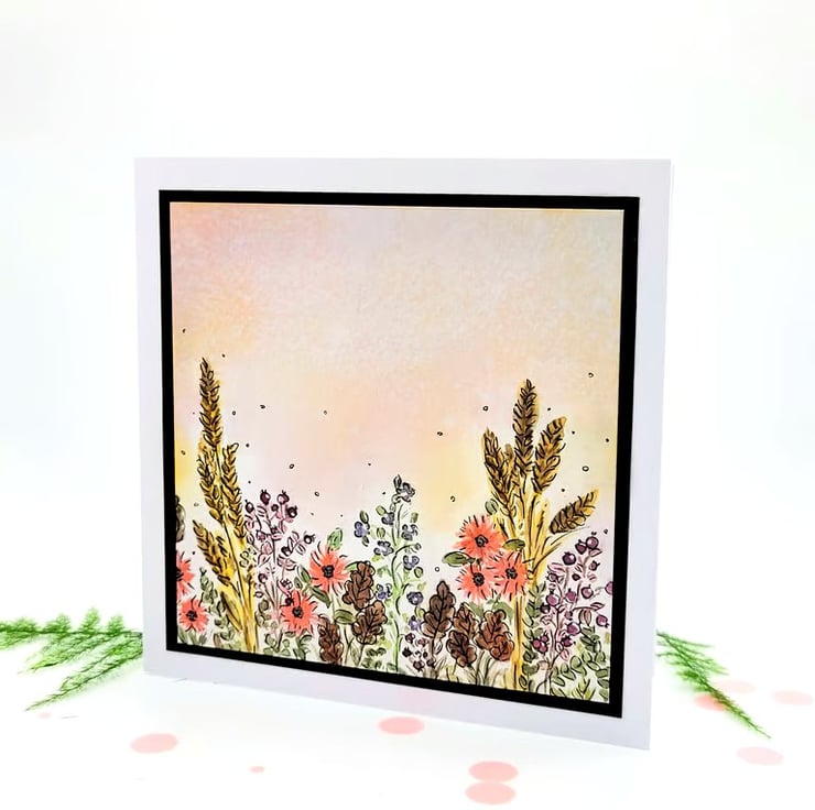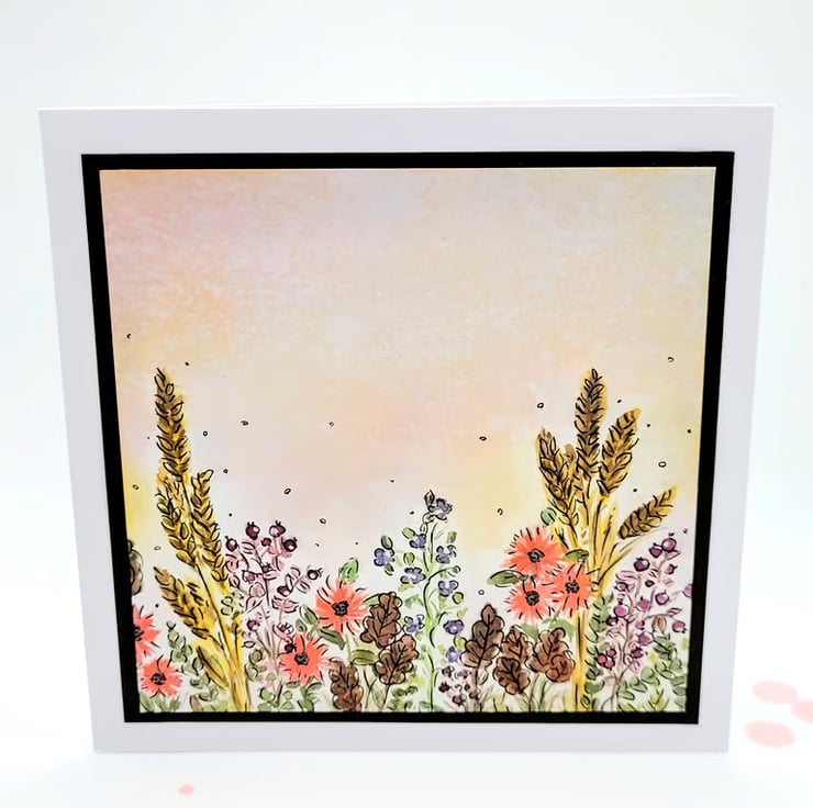A blank card, measuring 12.5 x 12.5 cms, with wildflowers, berries and foliage. Handpainted and perfect for many occasions including a birthday.