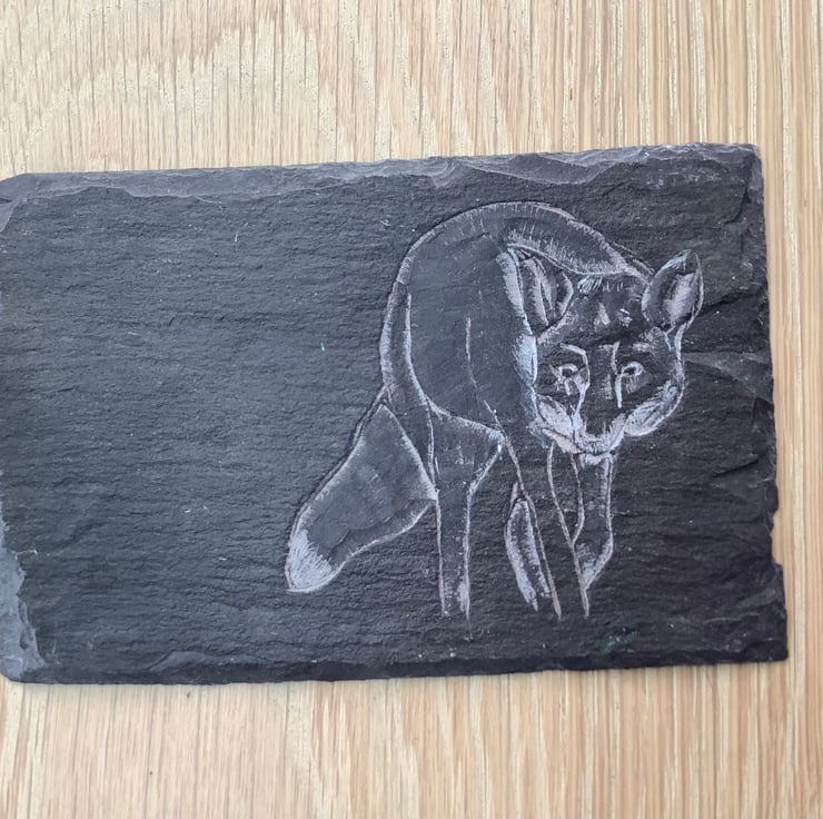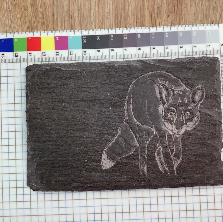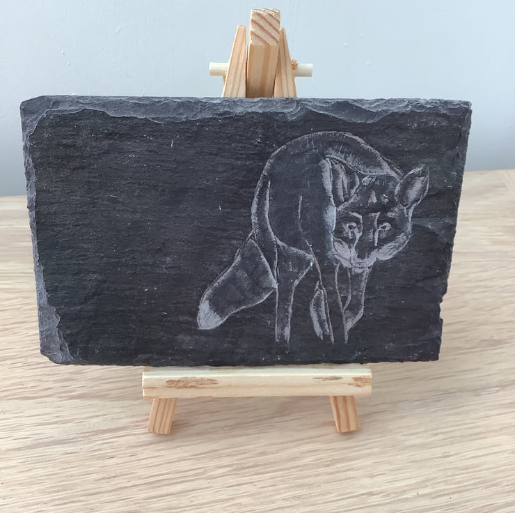 A stalking fox - this picture is carved onto a piece of slate. It is provided with the display easel which is included in the price.