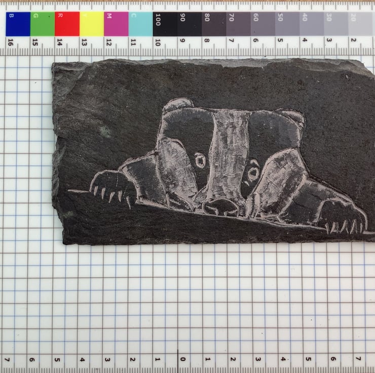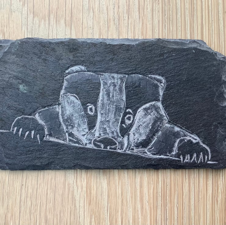 Delightful peeping badger - this picture is carved onto a piece of slate. It is provided with the display easel which is included in the price.