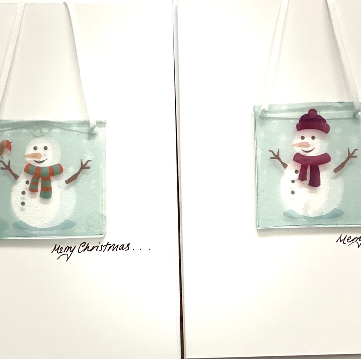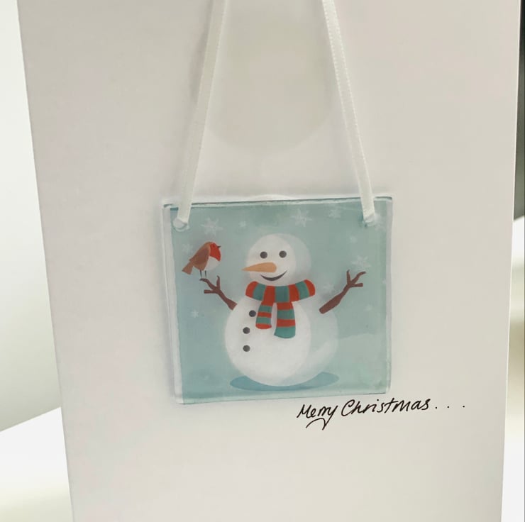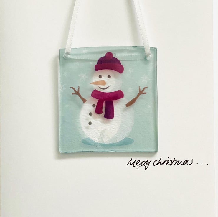 Lovely fused glass snowman hanging decoration which can be put up on the tree after the card is no longer needed . A Christmas card and a gift in one !