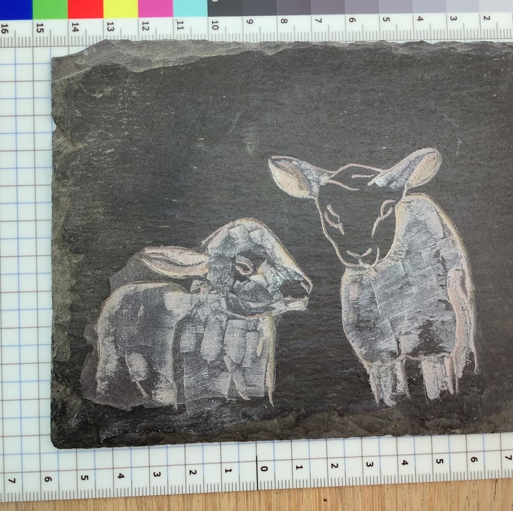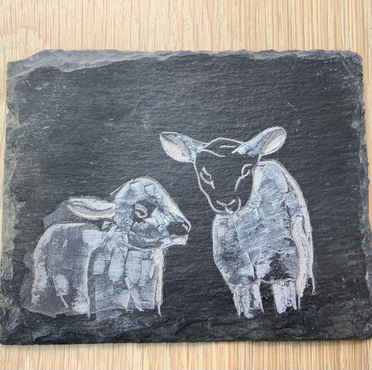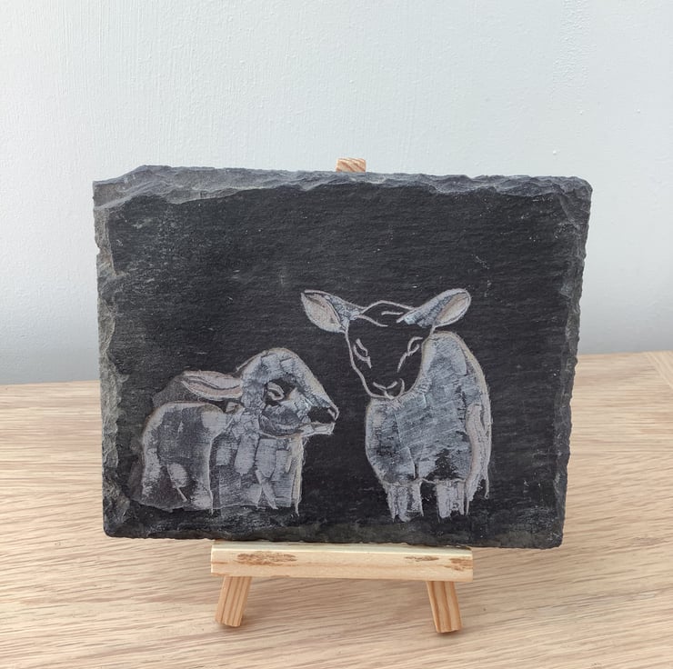 A couple of cute lambs cos lambs are cute right! - this picture is carved onto a piece of slate. It is provided with the display easel which is included in the price.