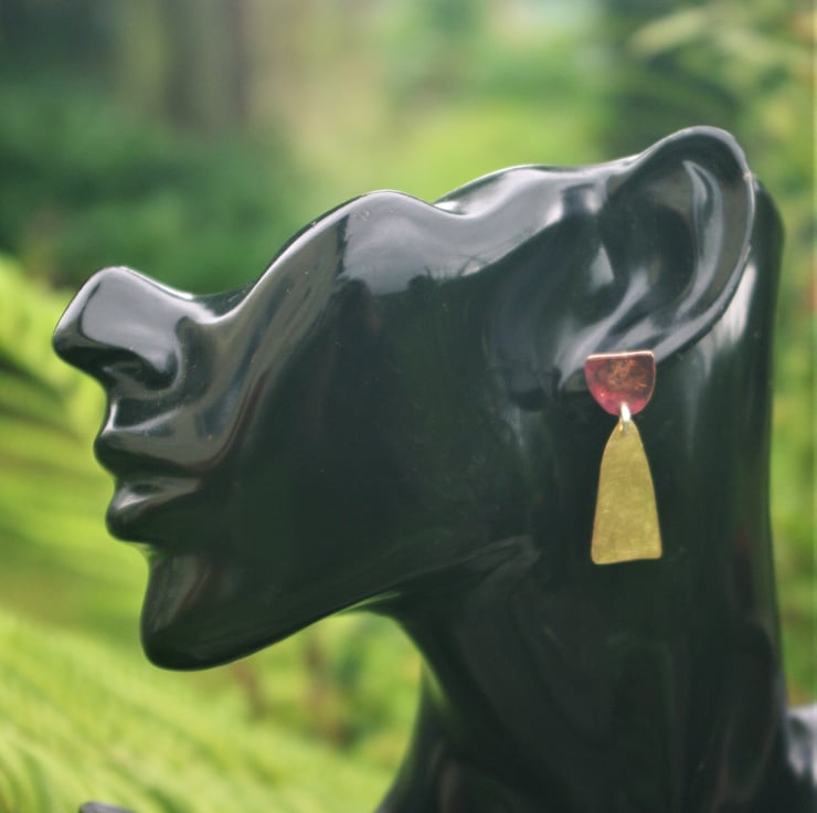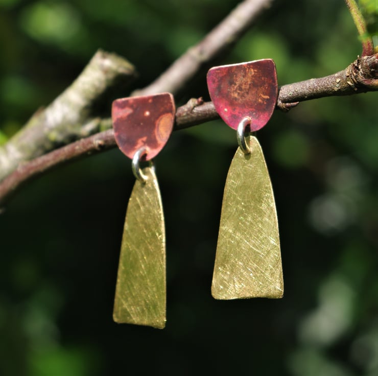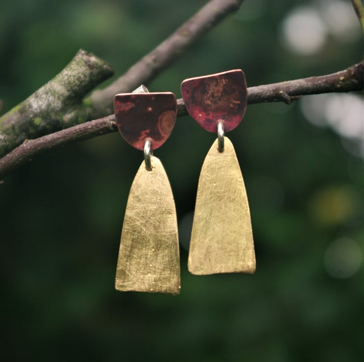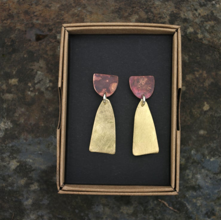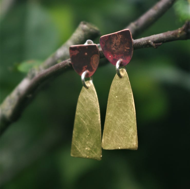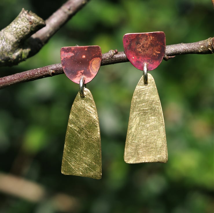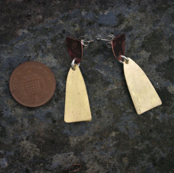 Total length of the earring is 38mm / 1.5 inches from the top of the copper piece to the bottom of the brass piece.