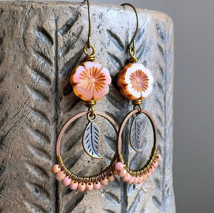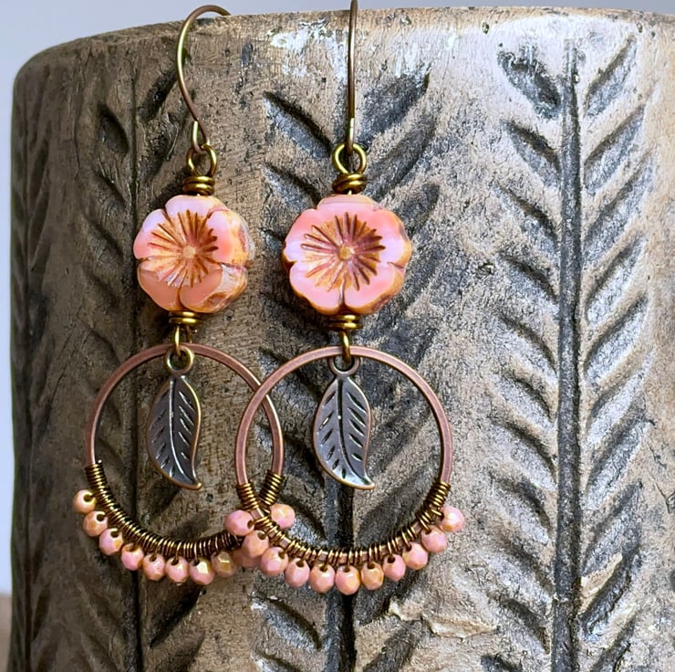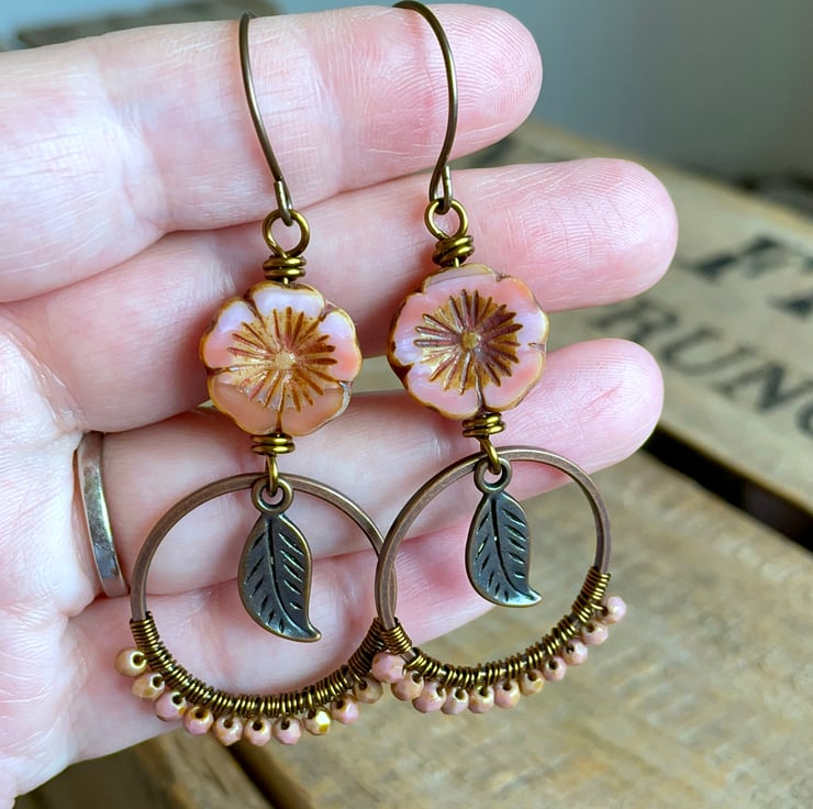 They feature Czech glass flower beads in a delicate shade of coral-peach, with a rustic Picasso finish around the edges and in their carved centres.