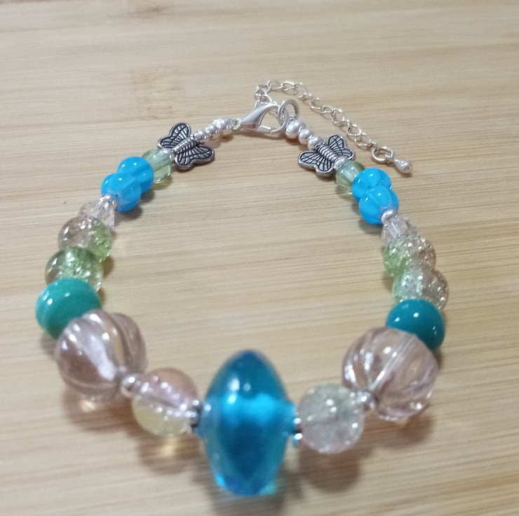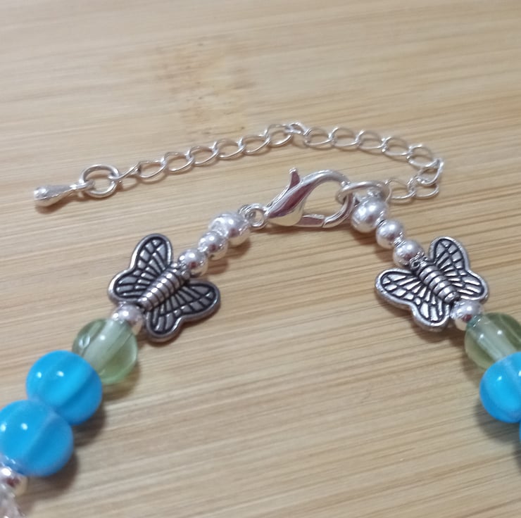 This is a very pretty bracelet with a good mix of complimentary beads in different shades of blue, green and clear glass, seperated with silver coloured spacer beads. It also features 2 pretty butterfly beads at each end. The beads are threaded onto a 0.45mm wire for strength and durability. The bracelet measures 21cm with a 5.5cm extender chain and has a stainless steel lobster claw closure. Supplied in an organza bag.