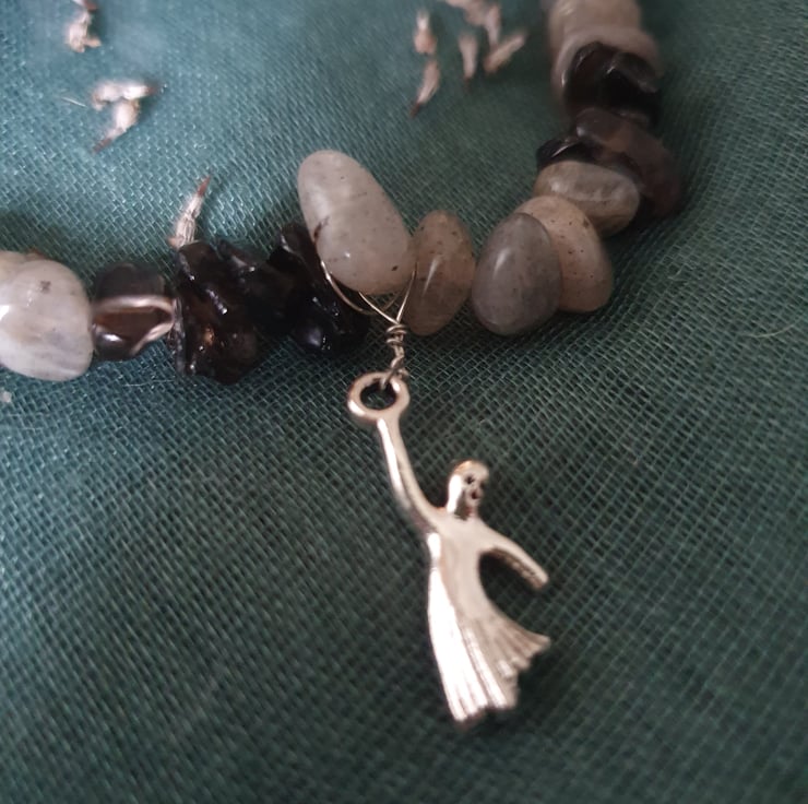 Halloween vibes with a ghostly charm, and some grey, smoky, misty inspired crystals.