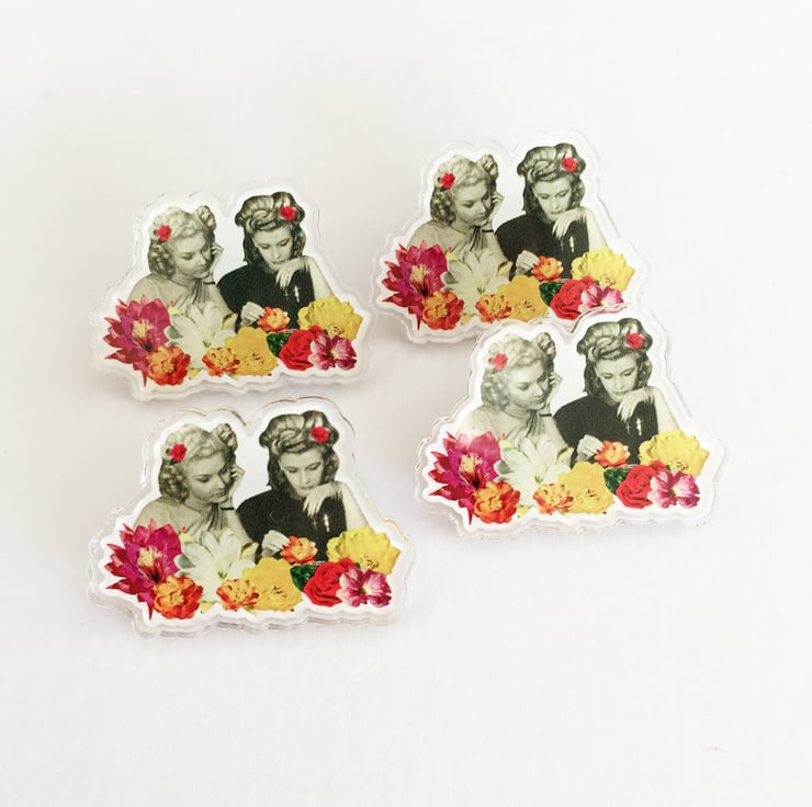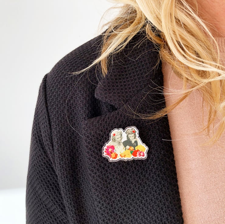 A sweet floral brooch featuring best friends enjoying a bit of flower arranging together.