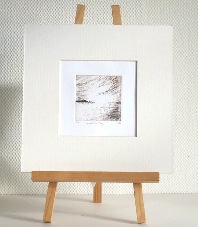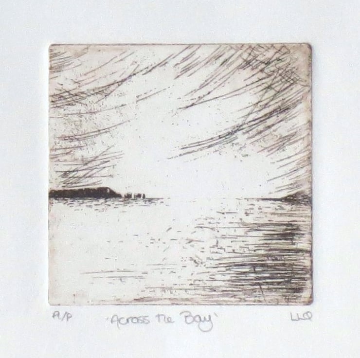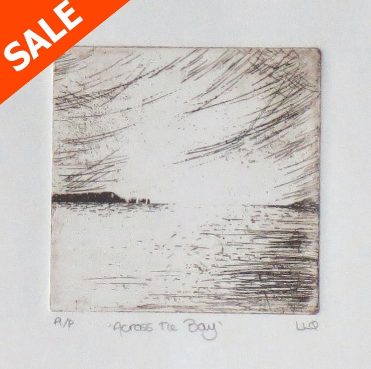 Original handmade etching print of a coastal scene printed in sepia ink on white paper.