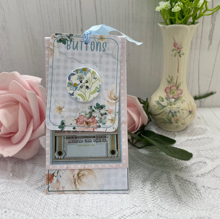 This tag is a sampler card with cream lace, vintage thread image double butterfly. Sewing machine advertising image and a purple rose flower. The same sewing machine advertisement is featured on the back, secured at the top. This leaves the back for your own message. A button card with a patterned wood button tied on with the outsert thread. All tied together with a faux silk blu ribbon.