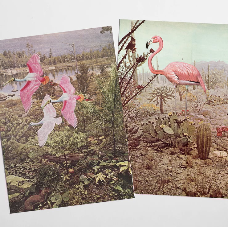 A set of two vintage style bird postcards. An ideal gift for flamingo admirers, spoonbill seekers or any bird lover in general.