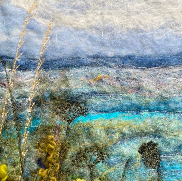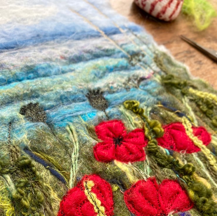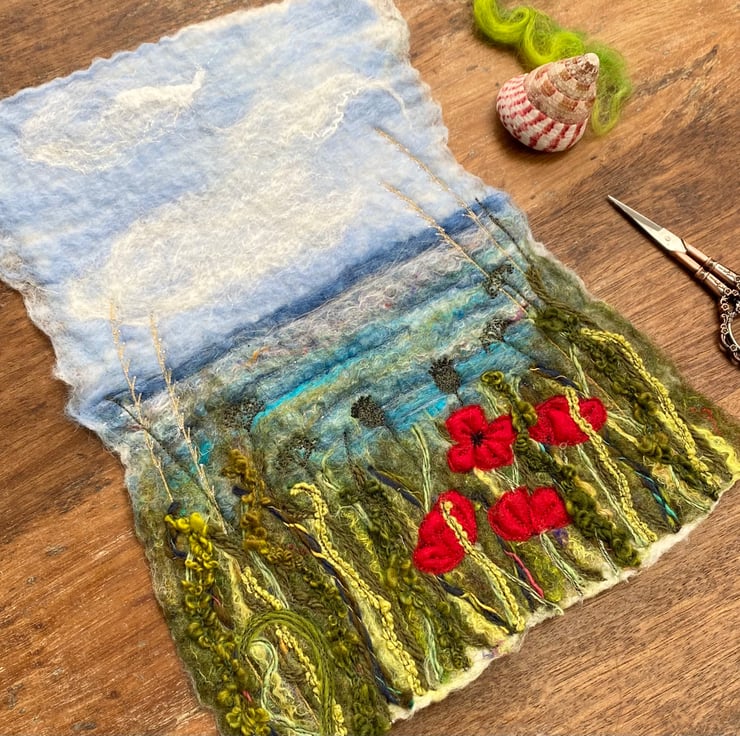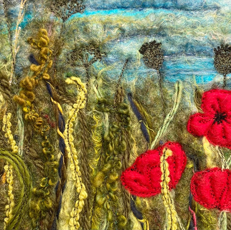 This stunning layered piece is based on one of my Saltburn by the Sea photos. It shows a summery blue sea viewed through grasses, plants and poppies. It’s a wet felting, needle felting and embellished with free motion embroidery.