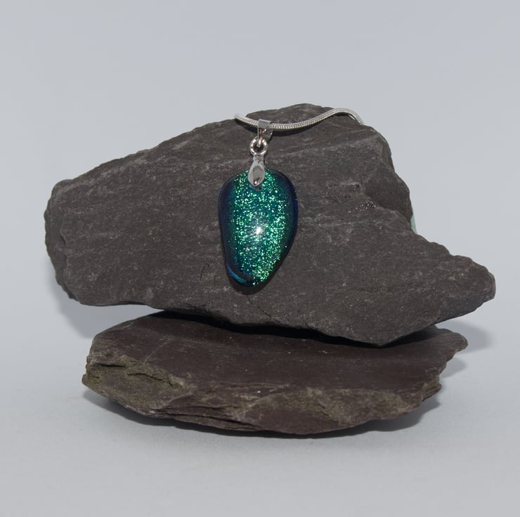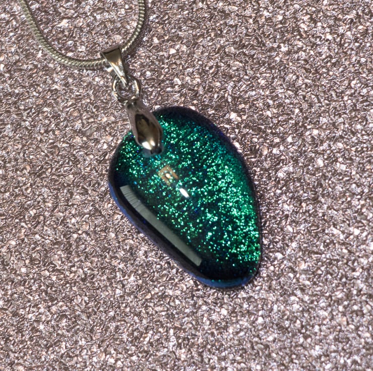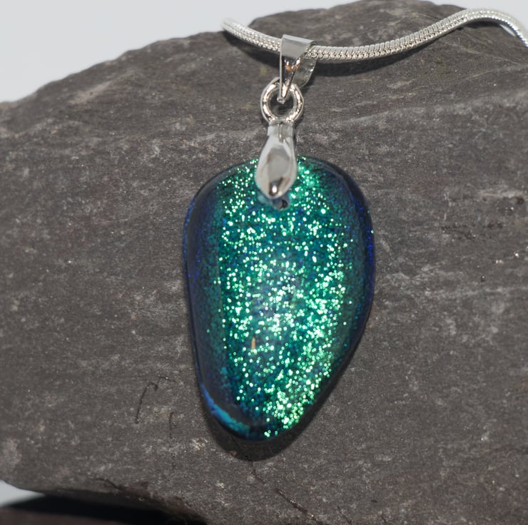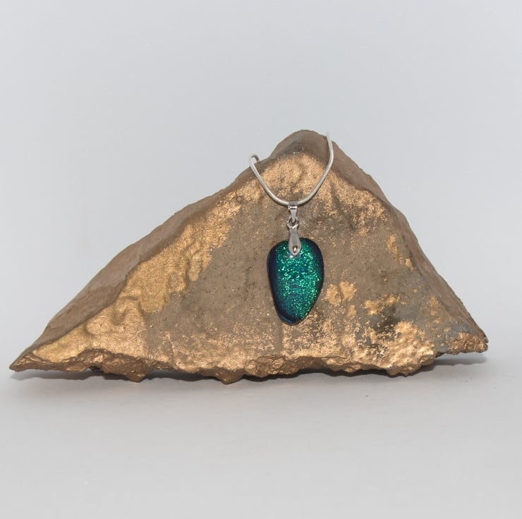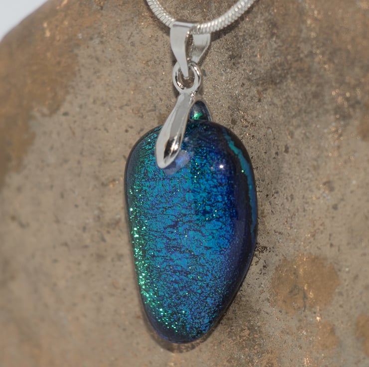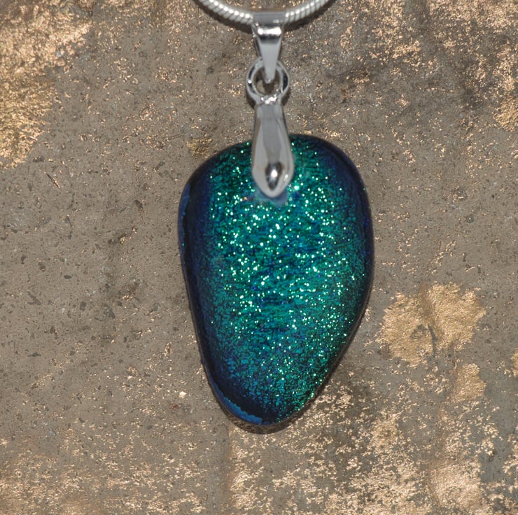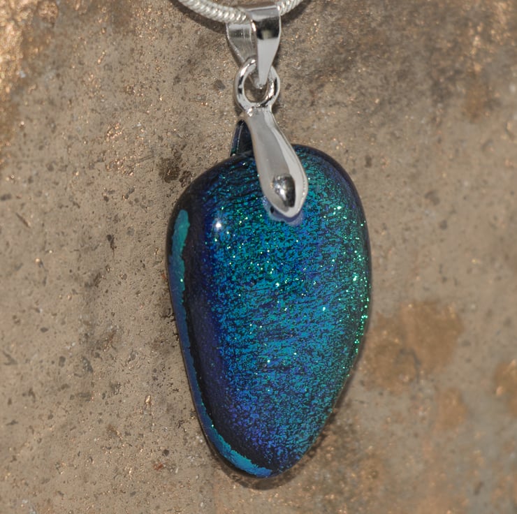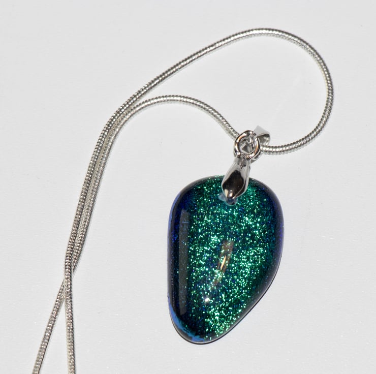 Constructed from a piece of hand-cut dichroic glass capped with a similarly shaped piece of clear glass, this pendant spent 12 hours in the kiln to achieve its basic shape and texture. Once cool it has been carefully drilled and the pinch bail fitted and the chain strung. Because the glass is hand-cut this piece is unique.
