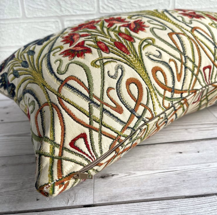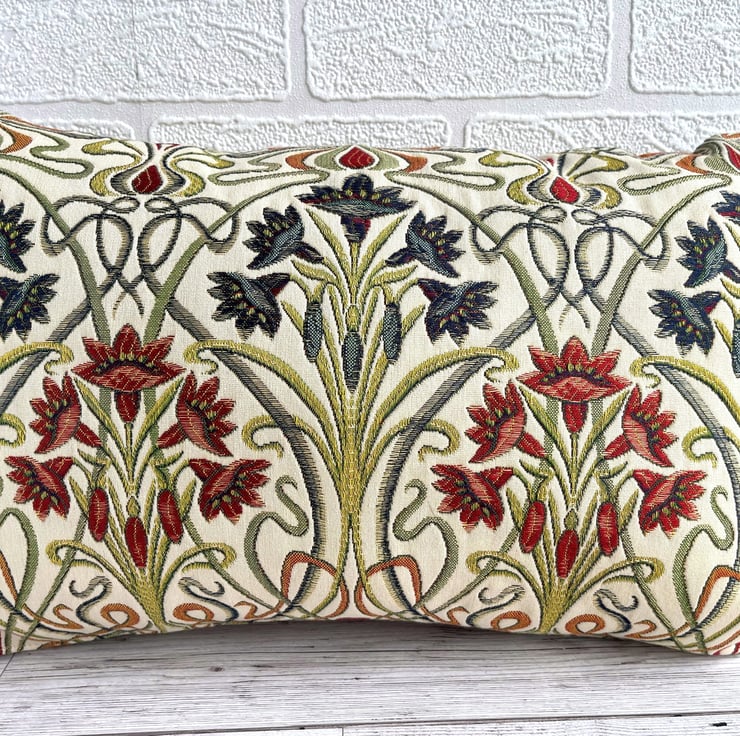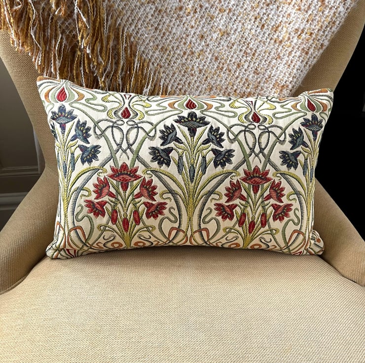 Art Nouveau cushion in Tiffany Jewel fabric. This lovely rectangular cushion is made from gorgeous Tiffany Jewel Art Nouveau style fabric. The fabric is a luxurious tapestry style jacquard with a floral and swirled pattern on a cream background. The pattern features alternating clusters of navy blue flowers and red flowers with yellow-green foliage. The flower clusters are surrounded by swirls and teardrop shapes in shades of green, navy, red and orange. The cushion cover has a concealed zip along the bottom and includes a polyester hollow fibre cushion pad which conforms to safety regulations.
