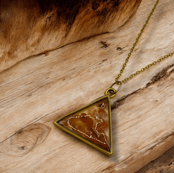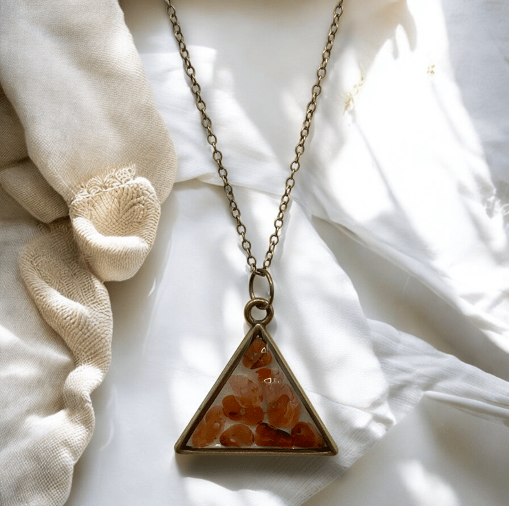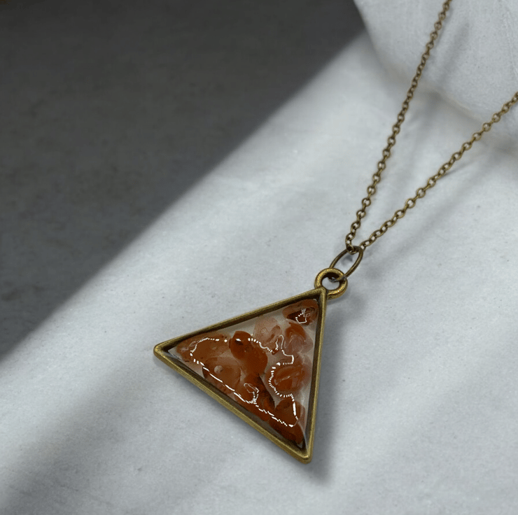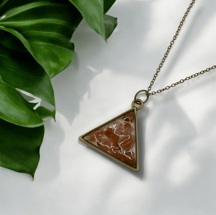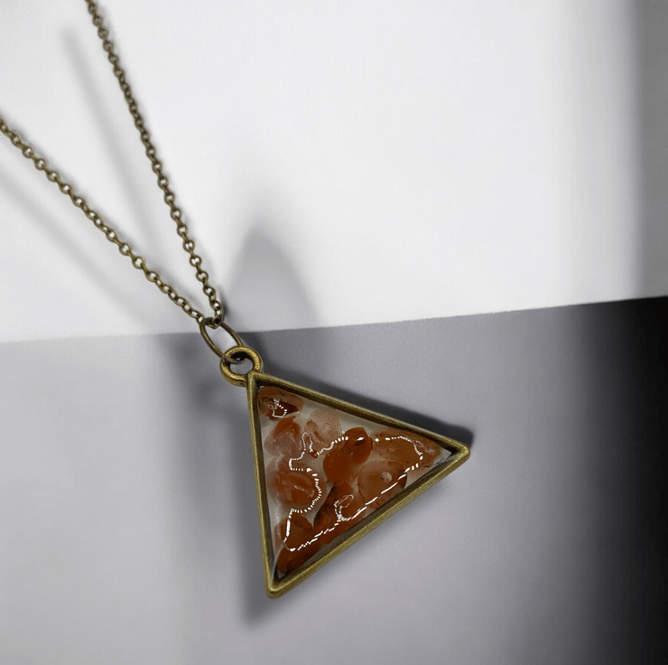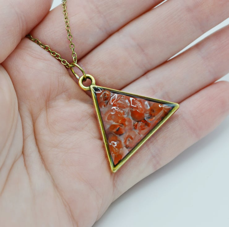 Handmade with Genuine Natural Carnelian chips. The tiny nuggets are cured within Vegan Friendly Eco Resin in an open Antique Brass plated Triangle bezel, as the focal point of this necklace and suspended from an Antique Brass plated cable chain completed with a Lobster Claw clasp.