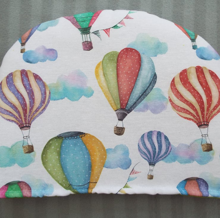 I came across this gorgeous hot air balloon fabric when I was searching for another product, but was so delighted with it I decided to feature it in a range of kitchen based items. There is a medium size2/3 mug tea cosy with a contrasting chartreuse coloured cotton lining,a small 1 mug tea cosy with a lilac cotton lining, two different colourways of mug rugs and I also made placemats