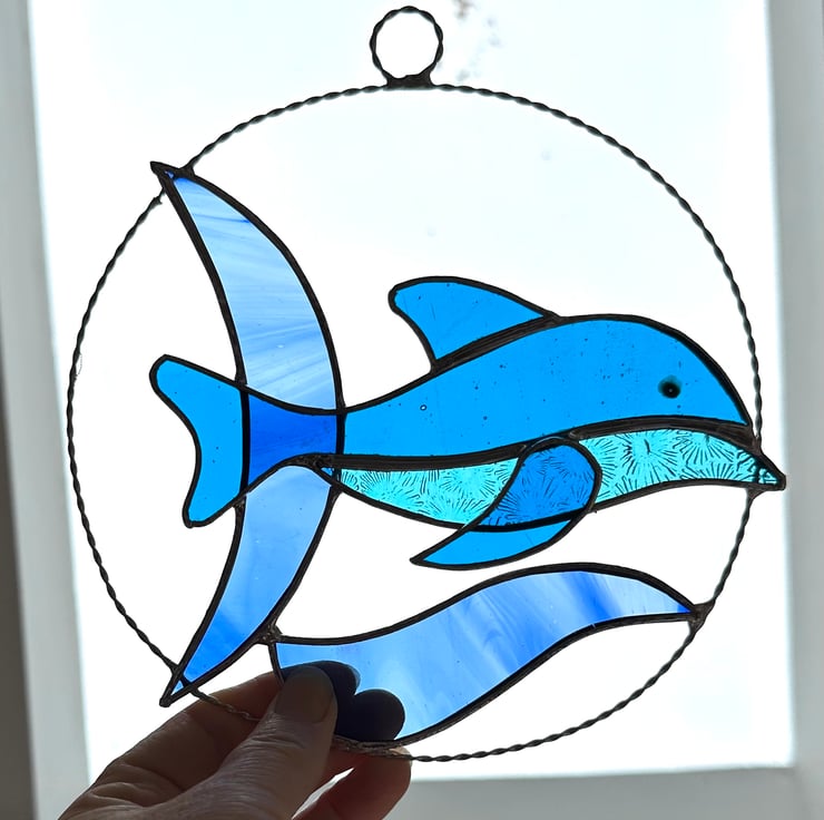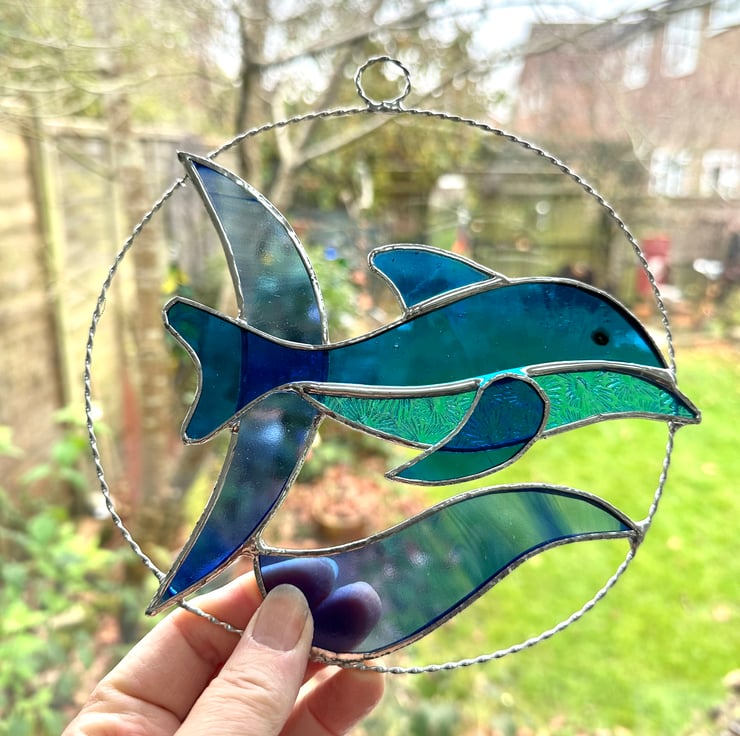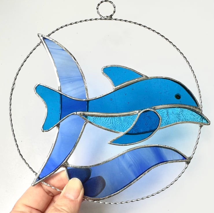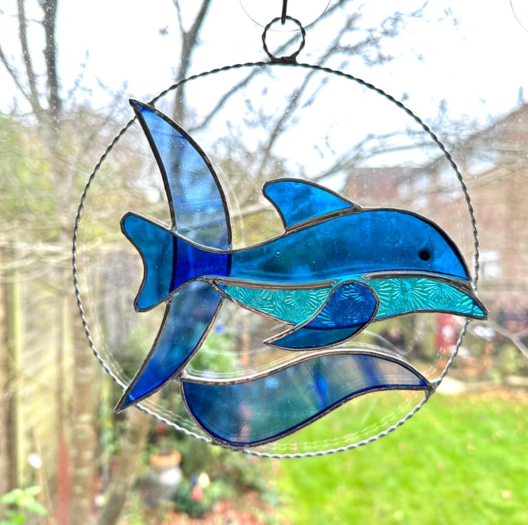 Each piece of glass has been cut by hand, ground and washed, foiled and soldered together before being washed again and polished. The dolphin and waves have been attached to a ring of twisted inner wire and the dolphins eye is glass paint.