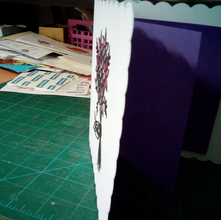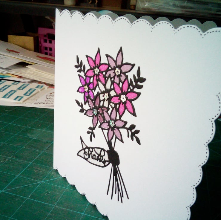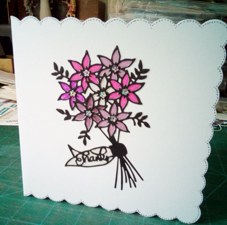 A completely handmade and uniquely designed card. Consisting of a pretty bunch of flowers die cut from black card. Mounted onto quality pristine white card. Hand coloured with a glittered effect.