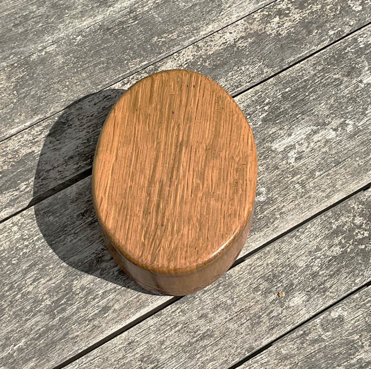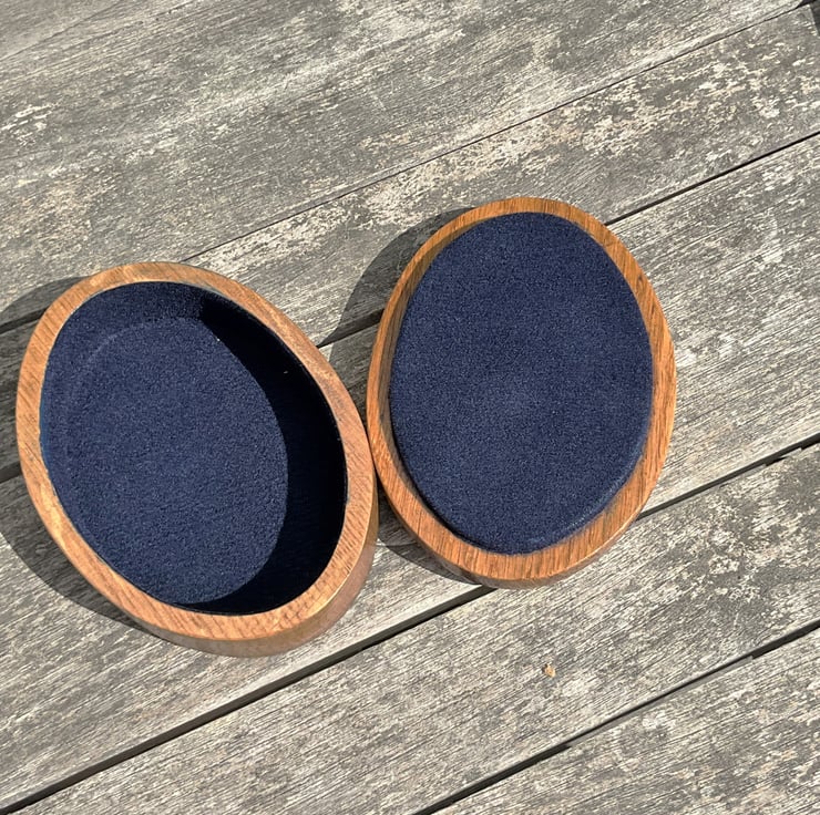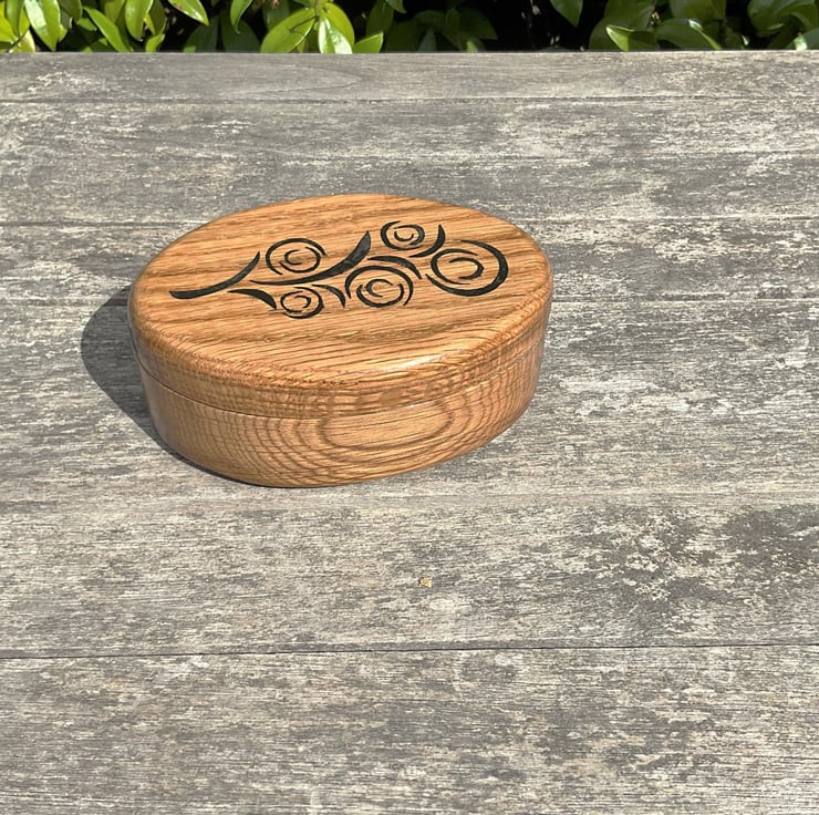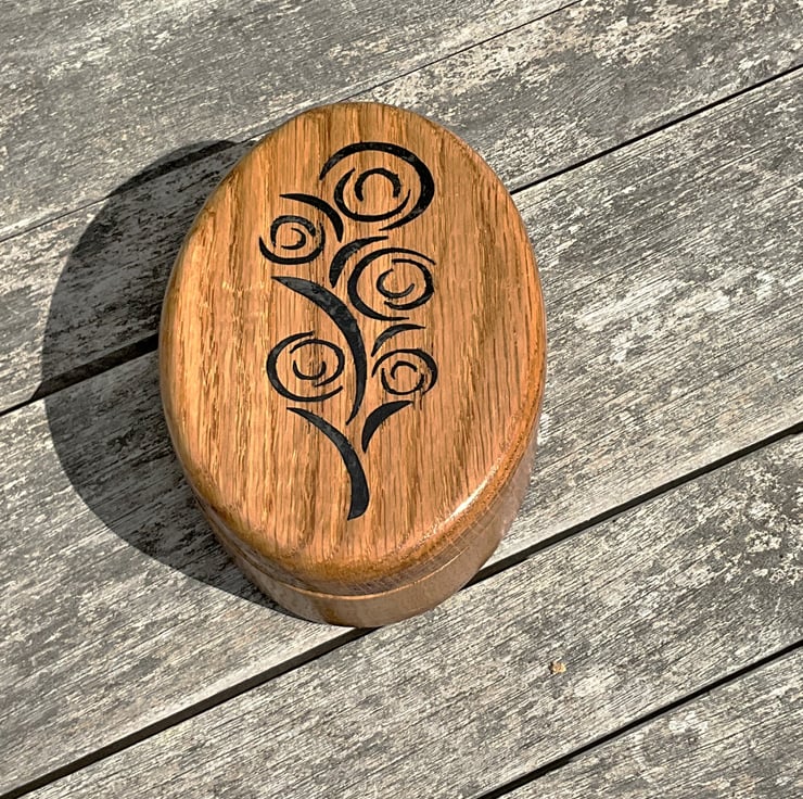 A beautiful oval shaped jewellery / trinket box made from solid oak. The top is decorated with an inlaid pattern of a stylised tree. Externaly the box is finished in a durable light satin sheen, internally the surfaces are coated in a soft navy blue flocking. The design, rather than being painted, has been cut through the lid and then inlaid with black epoxy, which will not degrade with polishing and will maintain the boxes appearance for years.