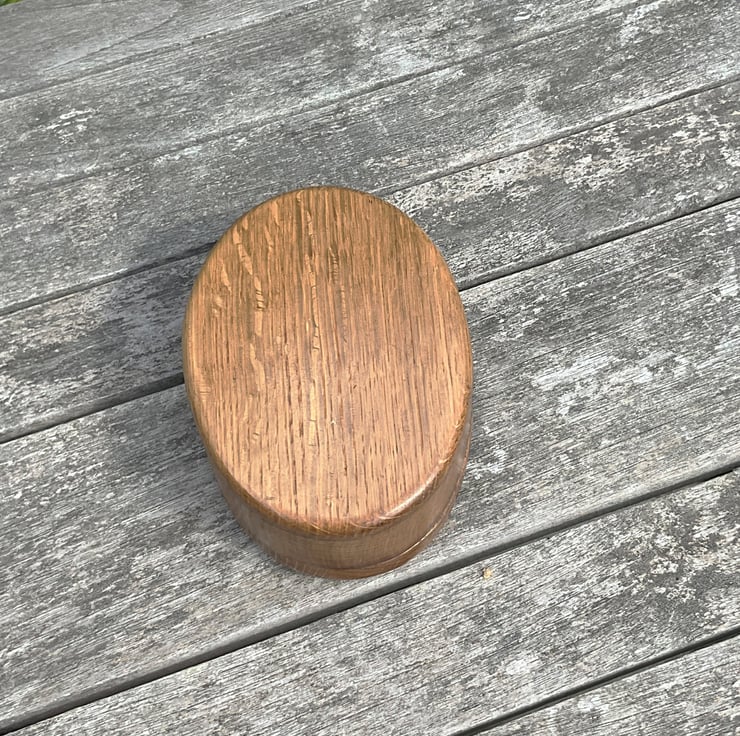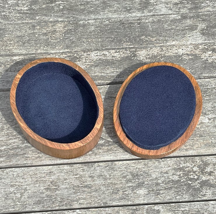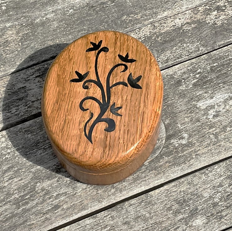 A beautiful oval shaped jewellery / trinket box made from solid oak. The top is decorated with an inlaid pattern of a stylised flower stem. Externaly the box is finished in a durable light satin sheen, internally the surfaces are coated in a soft navy blue flocking. The design, rather than being painted, has been cut through the lid and then inlaid with black epoxy, which will not degrade with polishing and will maintain the boxes appearance for years.
