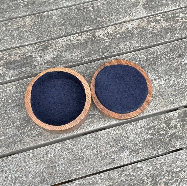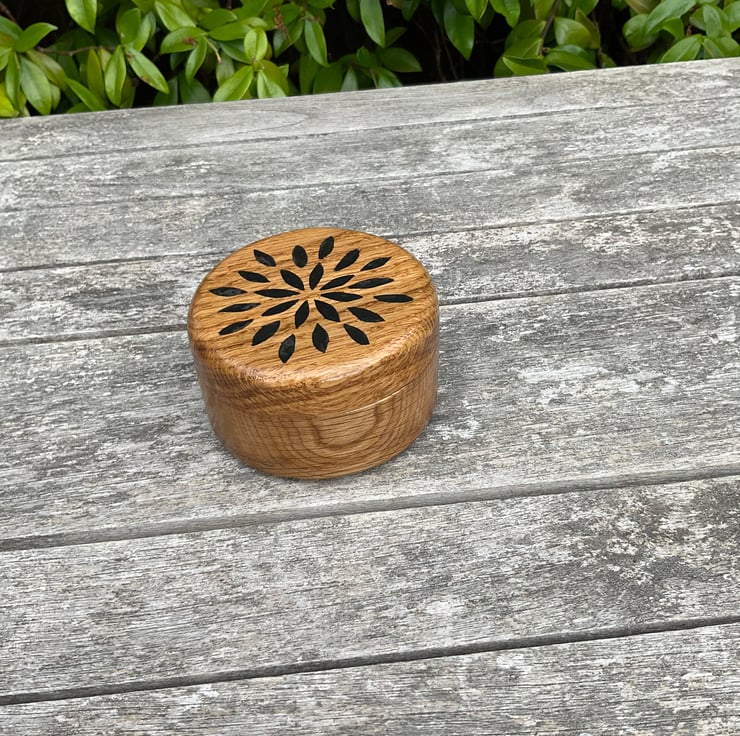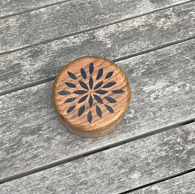 A beautiful round shaped jewellery / trinket box made from solid oak. The top is decorated with an symetric inlaid pattern. Externaly the box is finished in a durable light satin sheen, internally the surfaces are coated in a soft navy blue flocking. The design, rather than being painted, has been cut through the lid and then inlaid with black epoxy, which will not degrade with polishing and will maintain the boxes appearance for years.