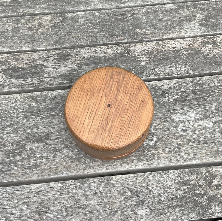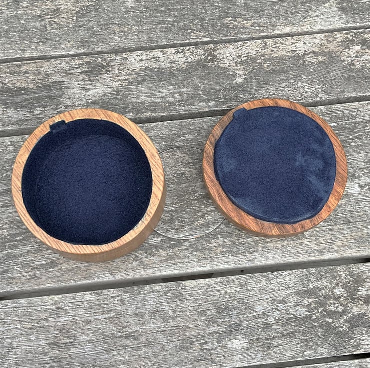 A beautiful round shaped jewellery / trinket box made from solid oak. The top is decorated with an flower pattern. Externaly the box is finished in a durable light satin sheen, internally the surfaces are coated in a soft navy blue flocking. The design, rather than being painted, has been cut through the lid and then inlaid with black epoxy, which will not degrade with polishing and will maintain the boxes appearance for years.
