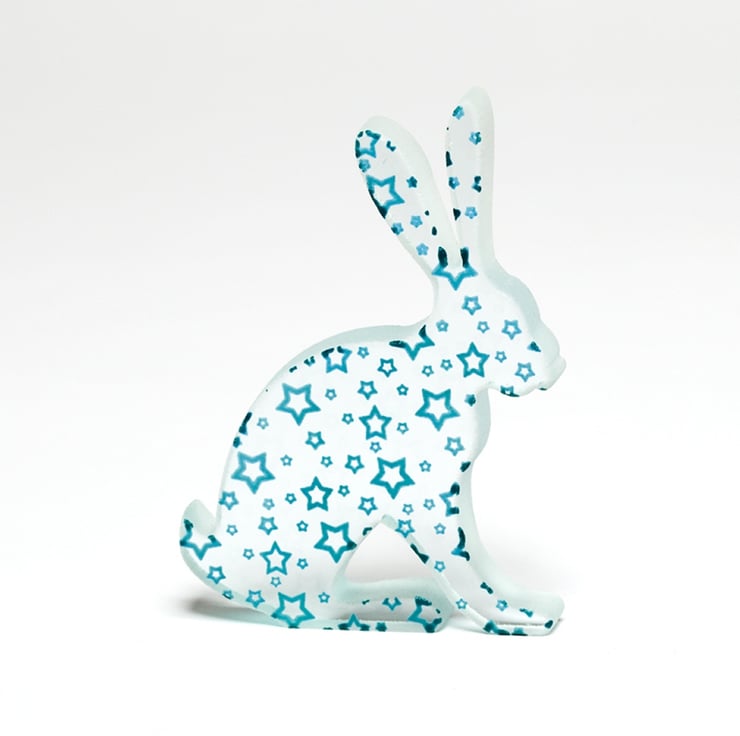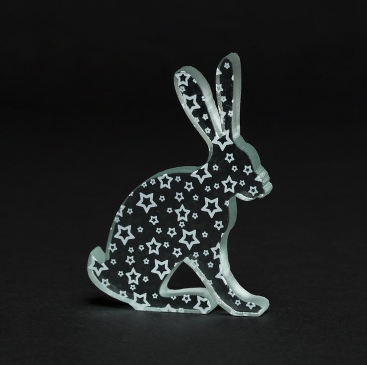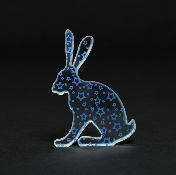 This design came about from the simple desire to just cover the hare shape with bright iconic star shapes, a little bit retro looking too depending on the colour used to print them, they also cast a great shadow when the light hits them.