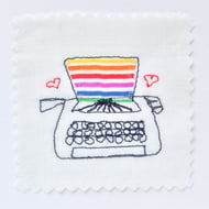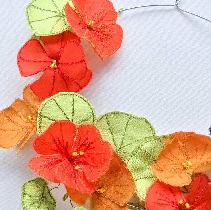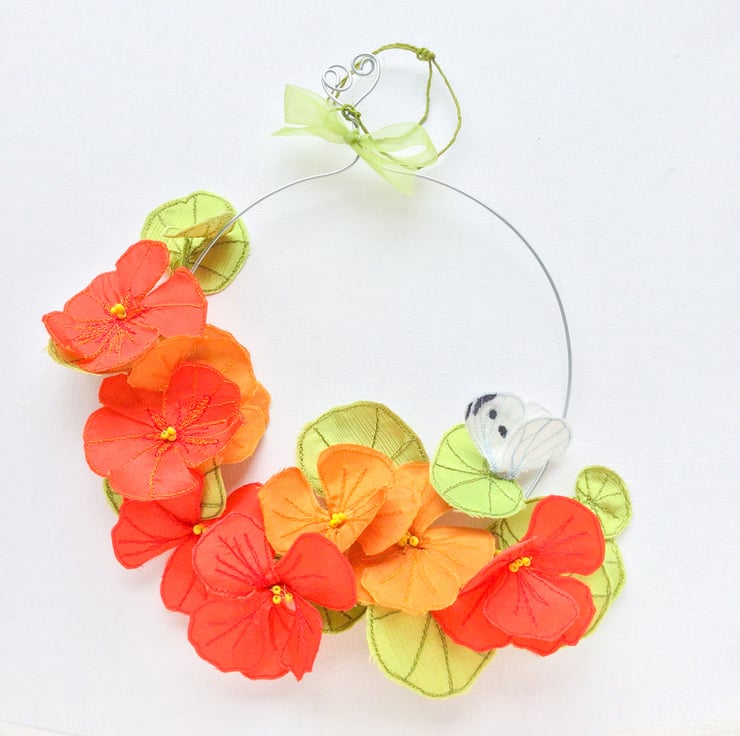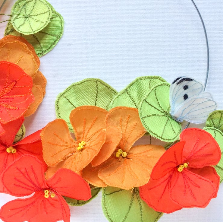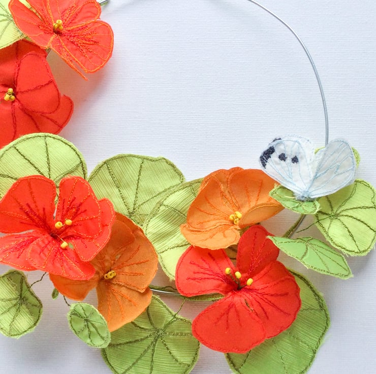 A floral nasturtium design made using freemotion embroidery. Each individual leaf and flower has been embroidered and wrapped to the wire wreath. Seed beads have been used for the nasturtium centres and a tiny cabbage white has landed for a rest! A piece of green hemp and chiffon ribbon mean this beautiful wreath is ready to hang.