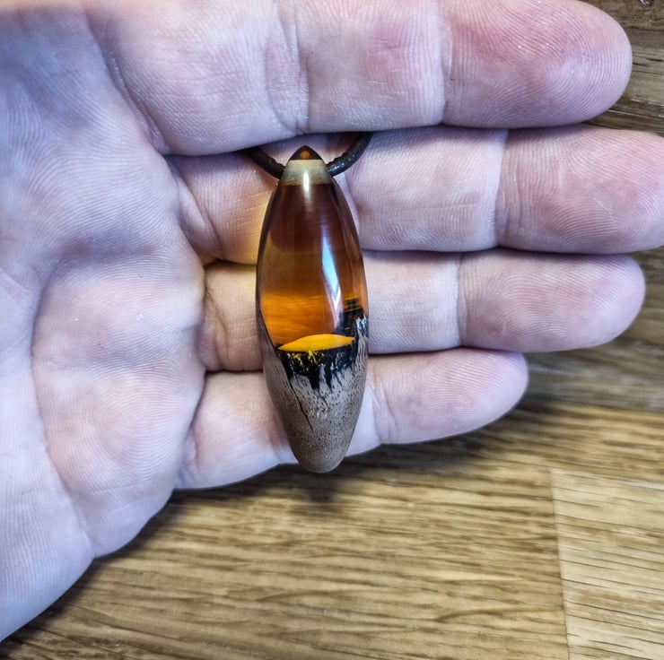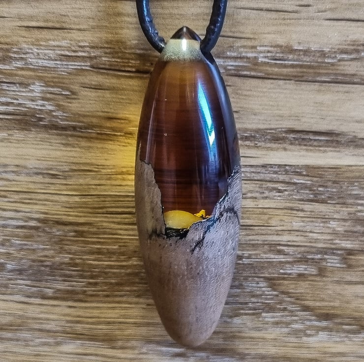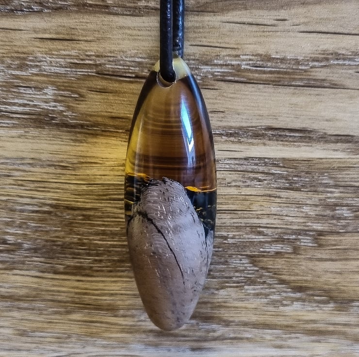 A stunning pendant of a crashed UFO in Agate made from Resin and Oak with a real leather necklace.