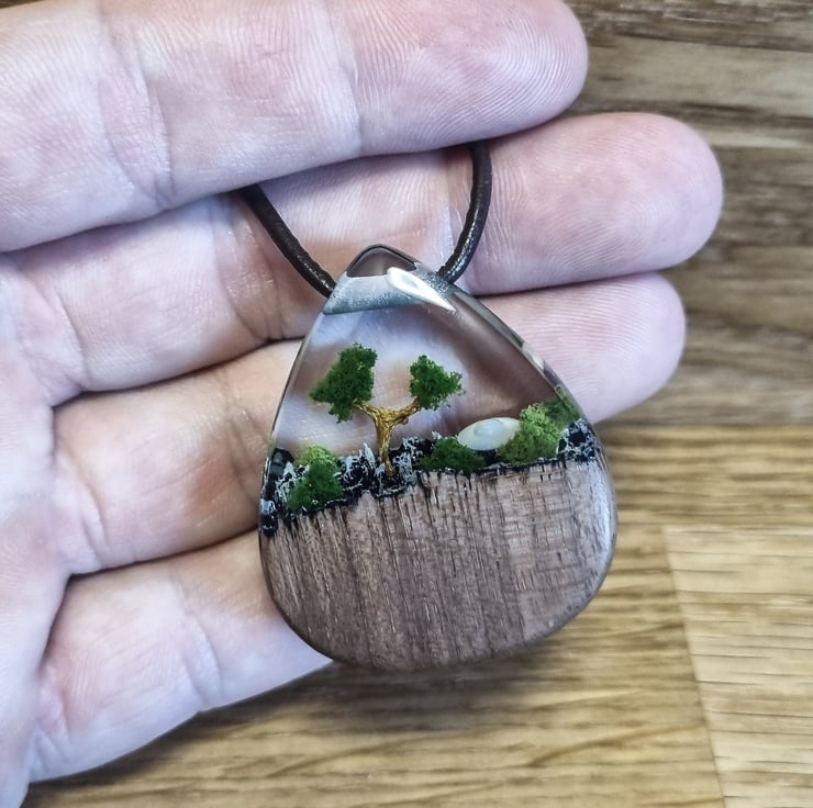 This really is an amazing Pendant with a UFO crash diorama inside made from clear Resin and Oak