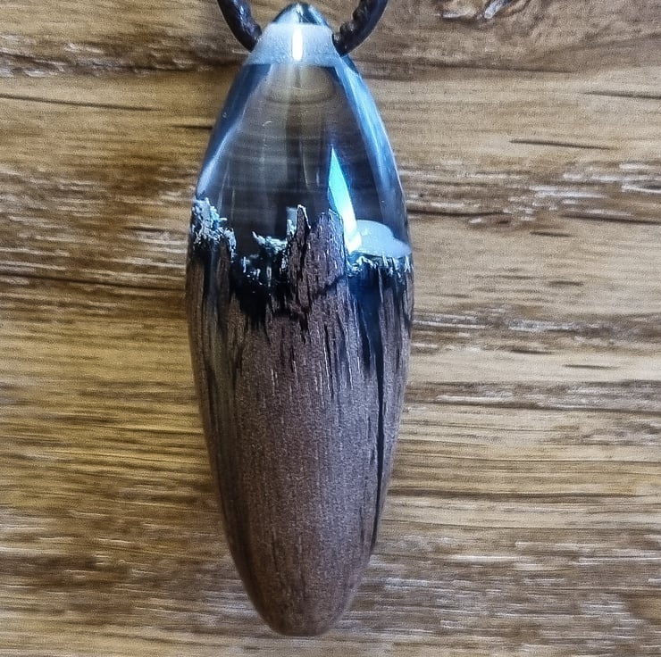 A stunning pendant of a crashed UFO in Obsidian made from Resin and Oak with a real leather necklace.
