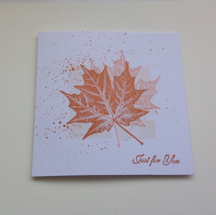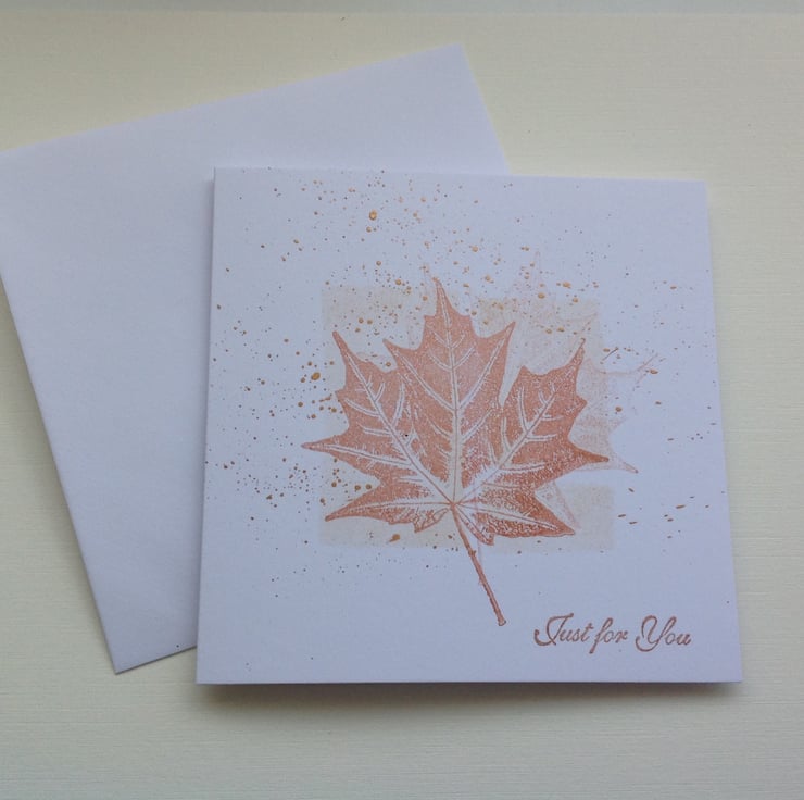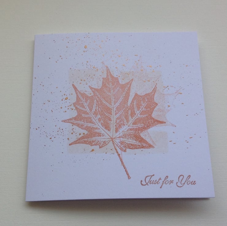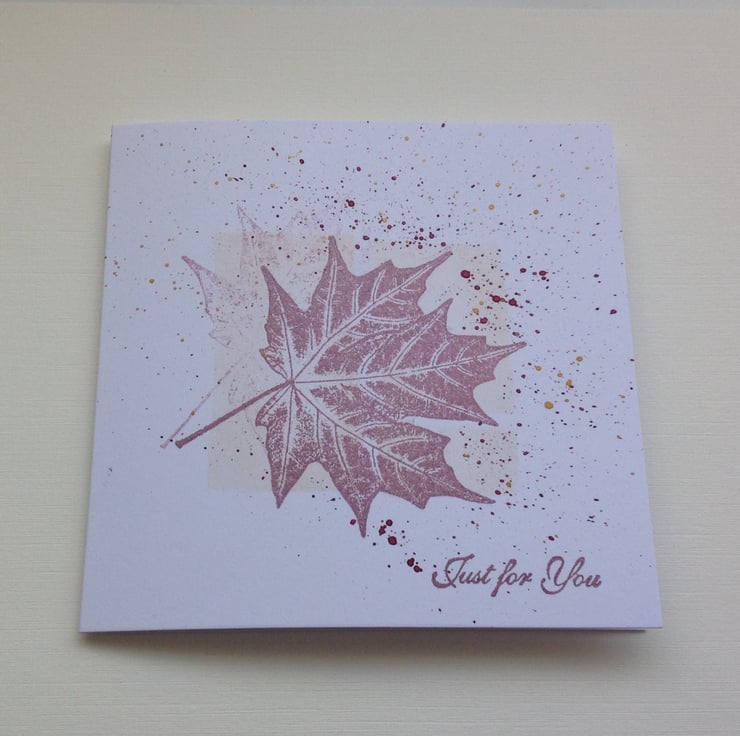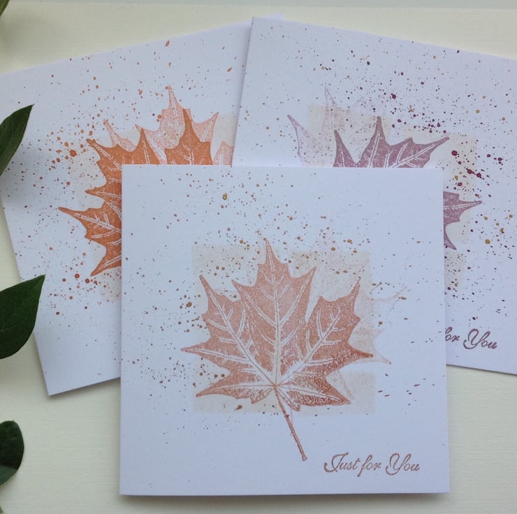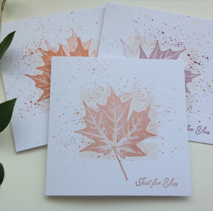 This is the ' Leaf Fall ' set. Comprising of 3 handcrafted greetings cards / notecards . Hand- stamped Maple leaf on to a square design 'shadow' stencil image , then spritzed with that all-important metallic shimmer . I've also stamped the sentiment 'Just for you' on to each,, which covers a multitude of occasions.
