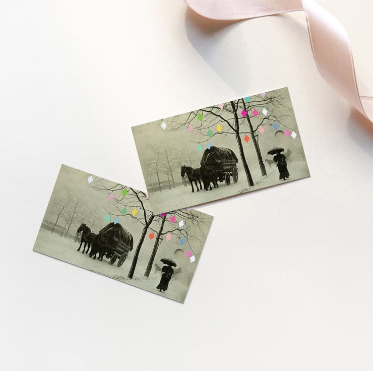 A set of 12 Christmas gift tags with string. Each tag features a pretty snow scene and is made by hand!