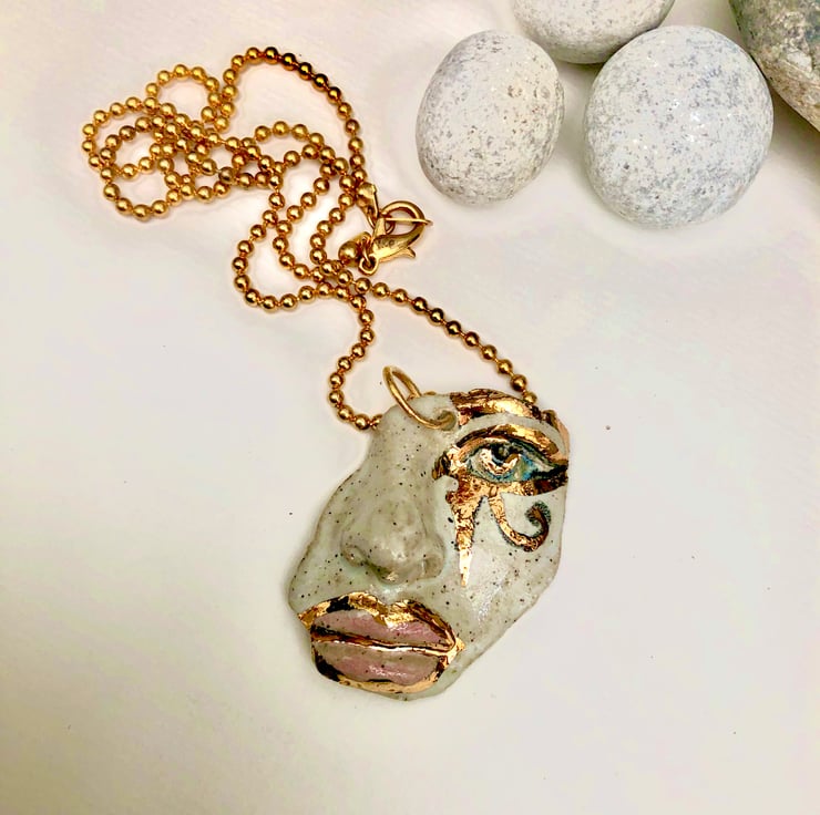 Unique and handcrafted in ceramic clay with eye of Horus gold lustre hand painted detail. Comes on a gold plated chain . Egyptian eye of Horus wards off bad luck.