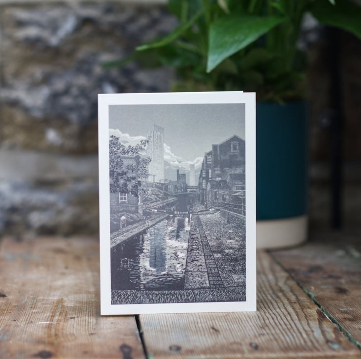 Lock 92 on the Rochdale Canal, Castlefield, Manchester. A6 (148 x105mm) greetings card printed from an original linoprint. These cards are printed on Aquerello 280gm card (acid free, chlorine free, made using FSC® Certified, environmentally friendly ECF pulp). Blank inside.