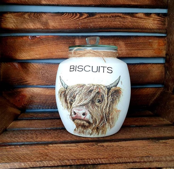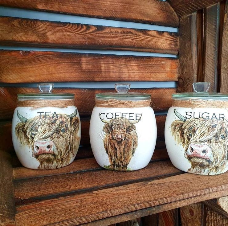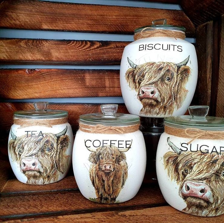 Tea, coffee and sugar, biscuit and utensil kilner jars with push fit lids. Painted and finished with highland cow design