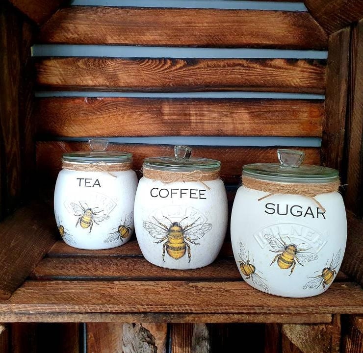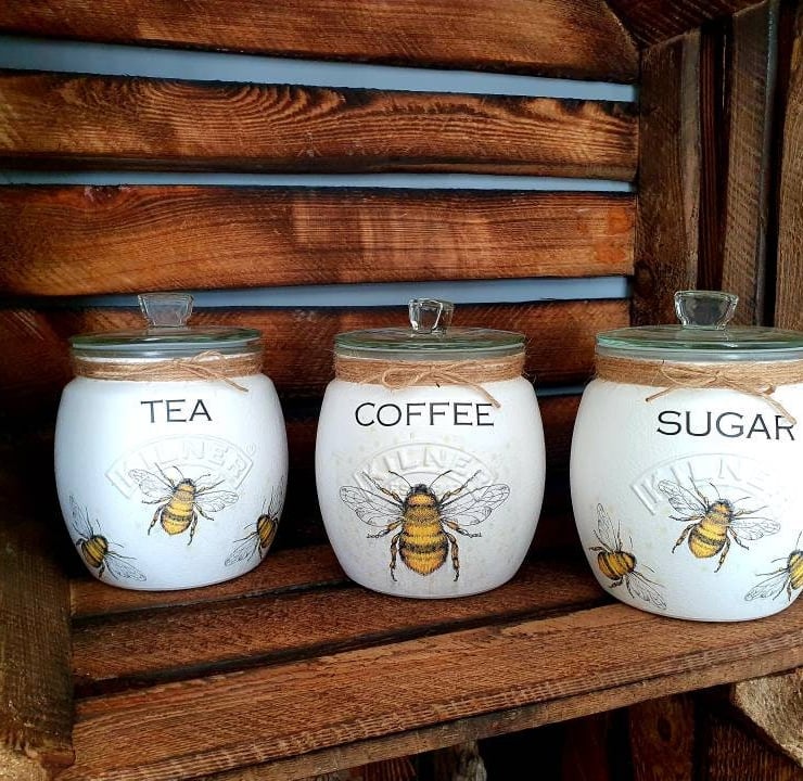 Tea, coffee and sugar, biscuit and utensil kilner jars with push fit lids. Painted and finished with Bee design