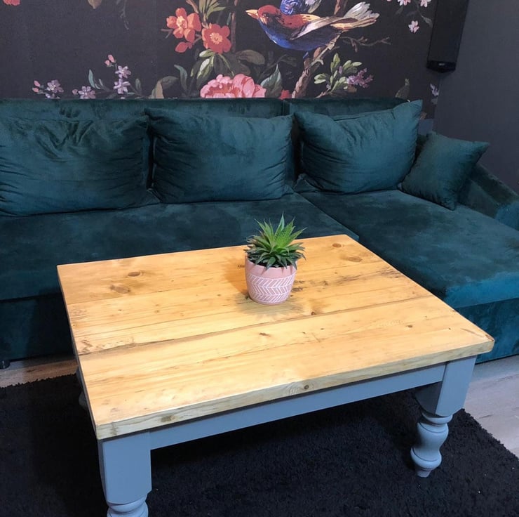 This handmade reclaimed wood coffee table with turned, farmhouse style legs is the perfect piece to complement your contemporary or traditional style living room.